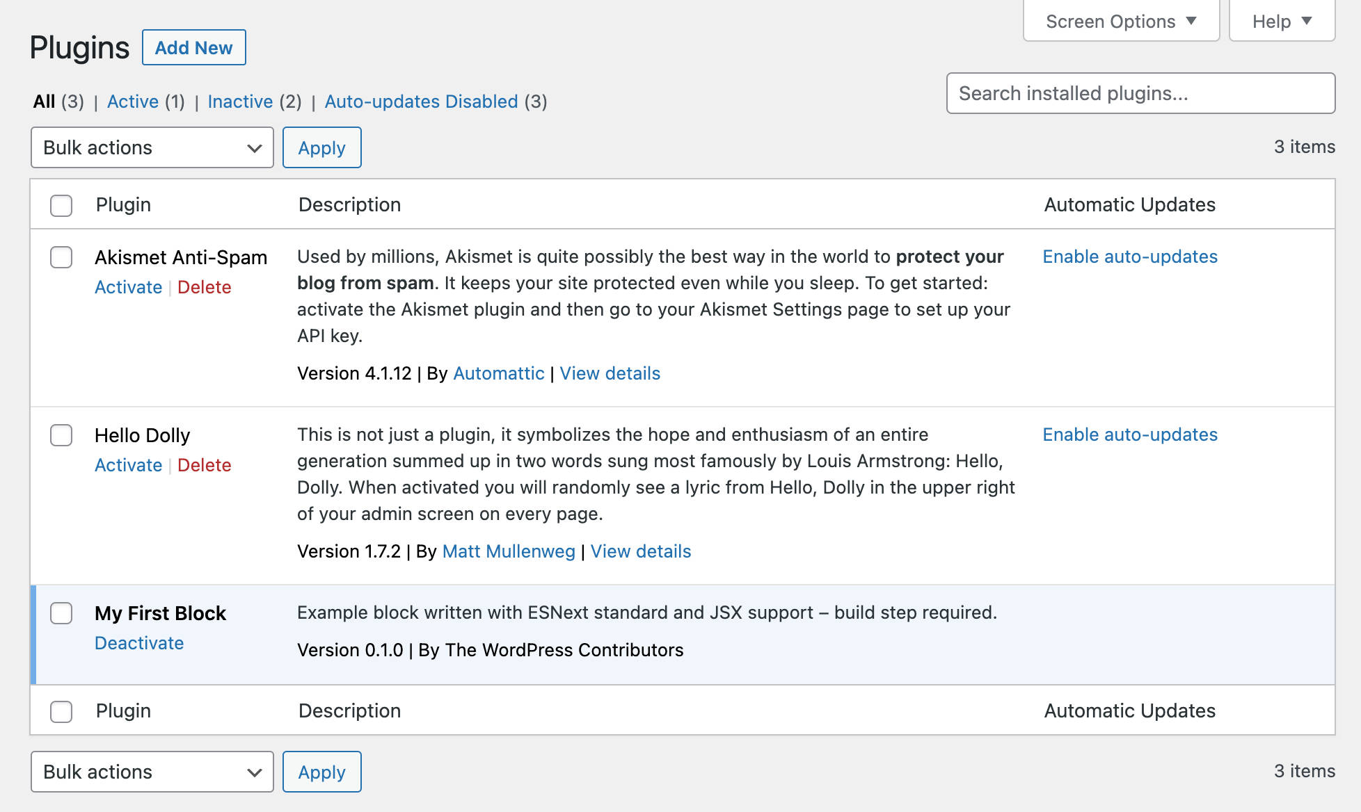 Now launch your WordPress development environment and go to the Plugins screen in the WordPress dashboard. A new plugin named “My First Block” should have been added to your plugin list: