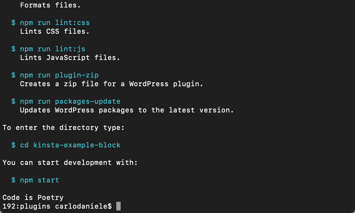 Once your local environment is up and running, you can set up a starter block by simply running the npx @wordpress/create-block command, and it will provide all the files and folders you need to create the plugin scaffolding and register a new block.