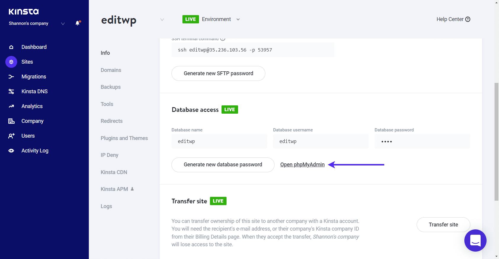 First, you will need to log in to phpMyAdmin. At Kinsta, we have an easy to access link to phpMyAdmin from within the MyKinsta dashboard. It’s located under your site’s “Info” tab in the “Database access” section.