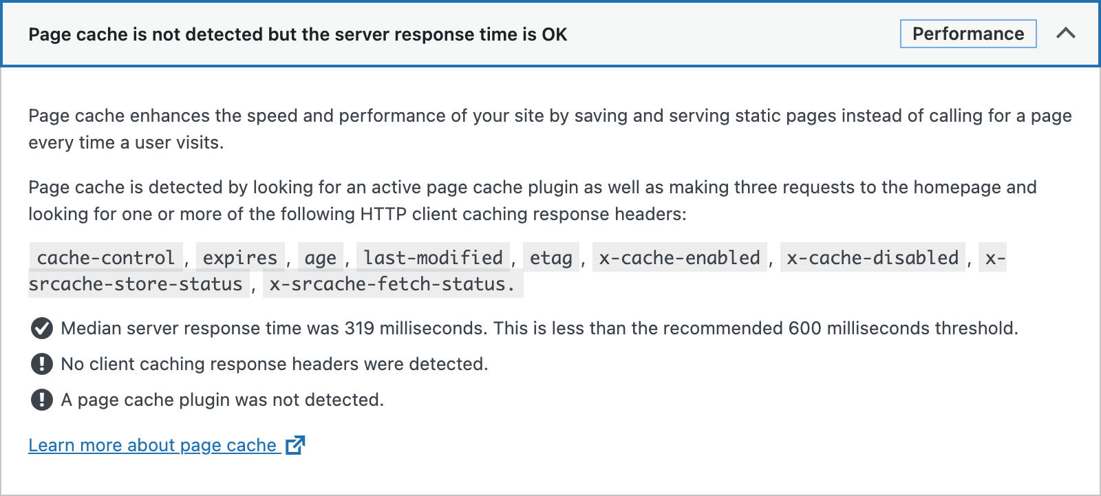 The Full Page Cache test checks whether the site is using full page cache and if the response time is OK: