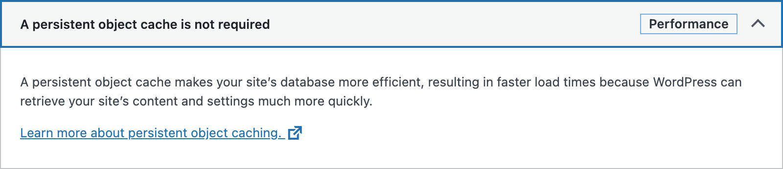 The Persistent Object Cache test determines whether the site uses a persistent object cache and, if not, recommends using it if it makes sense for the site.