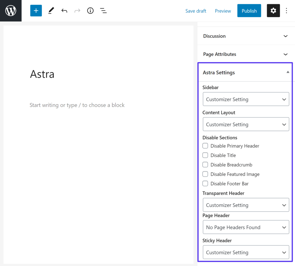 Astra gibt dir auch detaillierte Steuerelemente auf Seitenebene, einschließlich einiger zusätzlicher Optionen zur Steuerung des Kopfzeilenverhaltens. So kannst du zum Beispiel eine sticky oder transparente Kopfzeile auf Seitenbasis aktivieren.