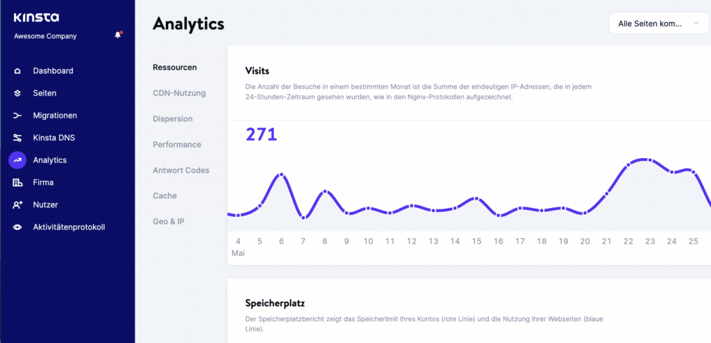 Die vollständigen Protokolldaten in Bezug auf die Analyse werden 30 Tage aufbewahrt. Wenn du Bedenken hast, das geplante Besuchslimit zu überschreiten, empfehlen wir, nach der ersten Migration zu Kinsta den Bereich Dashboard und Analyse häufiger zu überprüfen. Wenn du eine unerklärliche Datenverkehrsspitze oder Inkonsistenz siehst, informiere unser Team, und wir können die Protokolle weiter untersuchen, um die Ursache zu ermitteln.