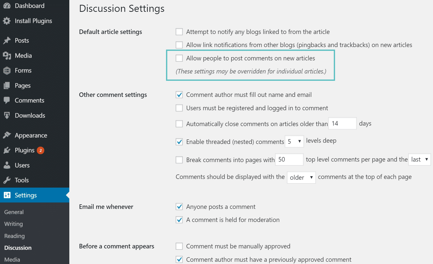Deaktiviere die Option, um Kommentare zu neuen Artikeln zu posten