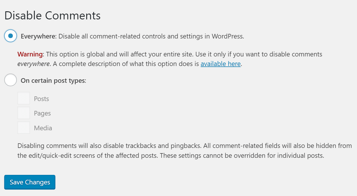 Mit diesem Plugin können Administratoren Kommentare sowohl global als auch nach Posttyp deaktivieren. Derzeit hat das Plugin über 1 Million aktive Installationen mit einer Bewertung von 4,9 von 5 Sternen. Du kannst unten in den Plugin-Einstellungen sehen, deine Optionen sind ziemlich einfach. Du kannst Kommentare überall mit einem Klick deaktivieren oder sie für Posts, Seiten oder Medienposttypen deaktivieren.