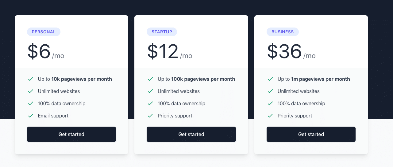 Der er tre prisfastsættelse niveauer på Plausible: 6 USD pr. måned Personlig plan, 12 USD pr. måned Startup-plan og 36 USD pr. måned business-plan. Der er yderligere 33% rabat for dem, der abonnerer på en årsplan.