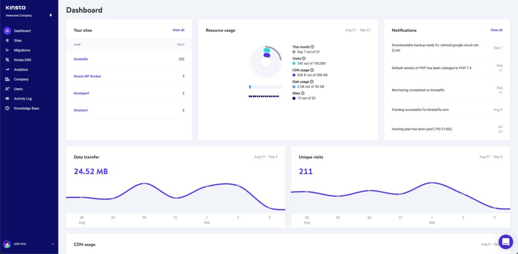 MyKinsta-dashboardet lader dig nemt administrere alle dine hjemmesider ét sted. Vi har bygget det specifikt til WordPress, så du finder WordPress-specifikke funktioner og værktøjer.
