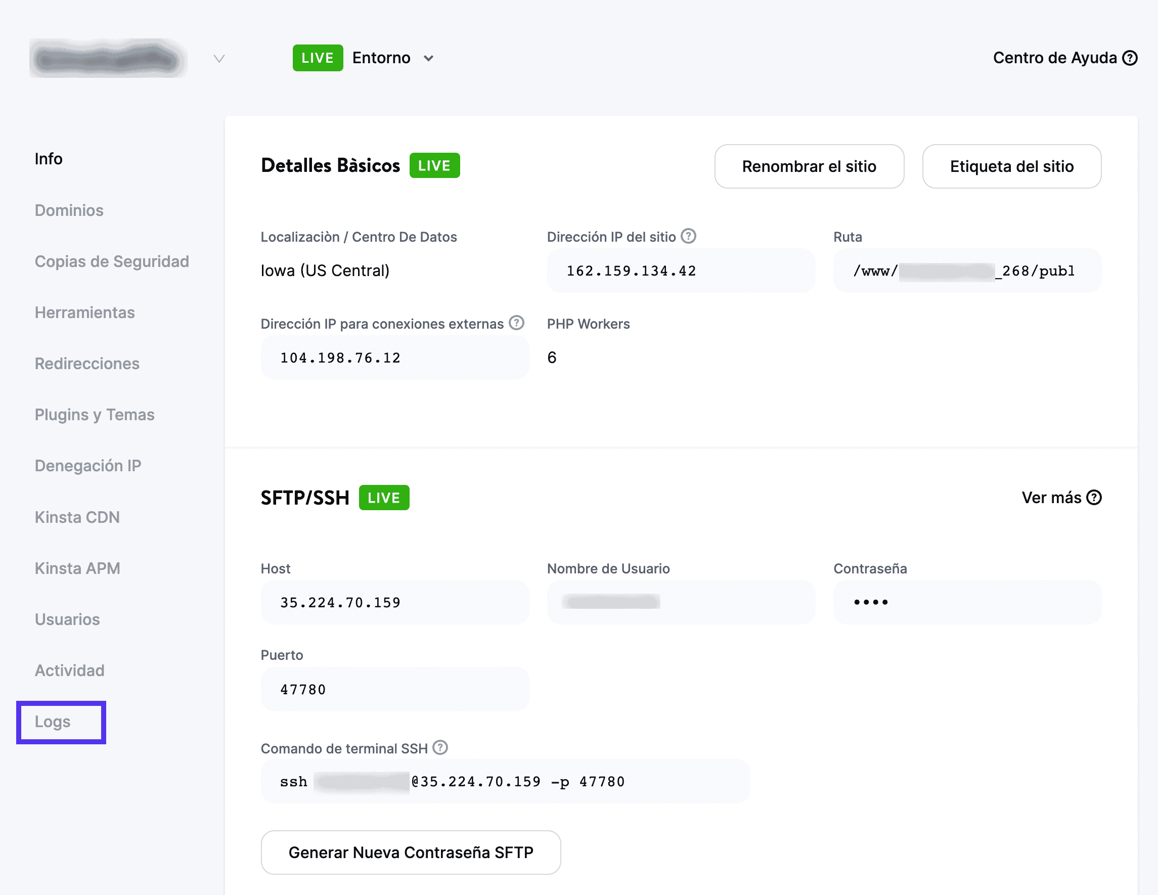Esto te llevará a la página de Información, donde podrás ver los detalles básicos de tu sitio web. En el lado izquierdo, haz clic en la pestaña Logs: