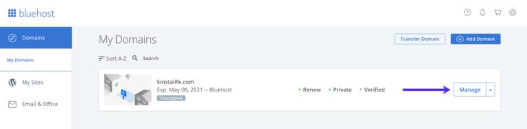 Ve a la página «Dominios» en tu panel de control de Bluehost, y haz clic en el botón Administrar junto al dominio al que quieres añadir un registro CNAME.