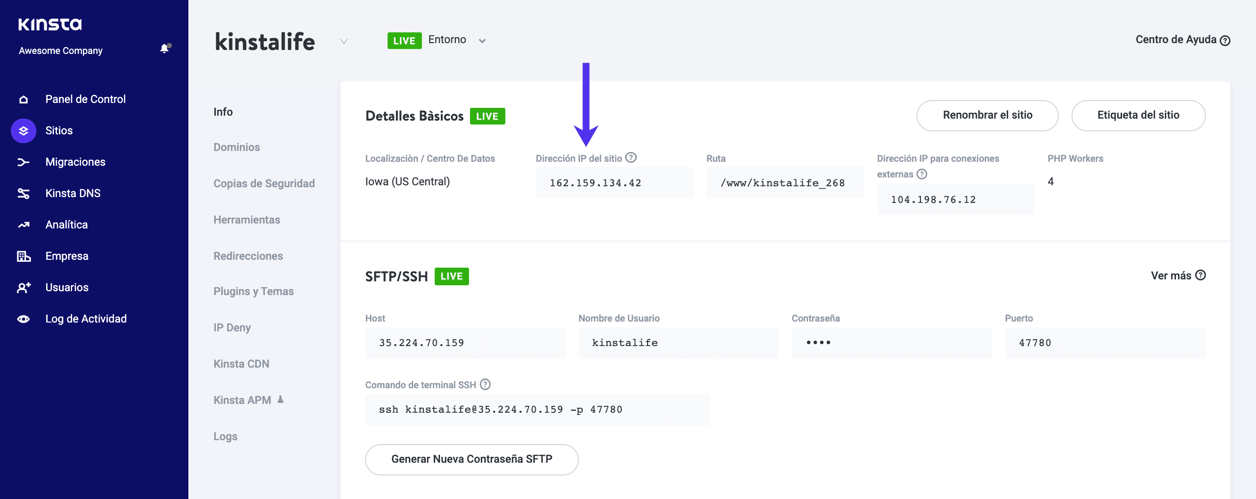 Para encontrar la dirección IP de tu sitio Kinsta, ve a Sites > [su-sitio] > Info en MyKinsta, y busca «Dirección IP del sitio» en «Detalles básicos». Esta es la dirección IP de tu registro Bluehost A.