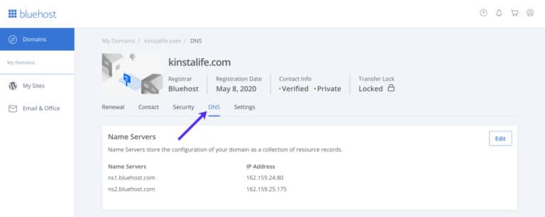 Si compraste tu nombre de dominio a través de Bluehost, hay dos maneras de dirigir tu dominio a Kinsta. La primera opción es apuntar tus servidores de nombre al DNS de Kinsta, nuestro servicio DNS premium. Si prefieres utilizar el servicio DNS de Bluehost, la segunda opción es apuntar un registro A y un registro CNAME a Kinsta desde Bluehost.
