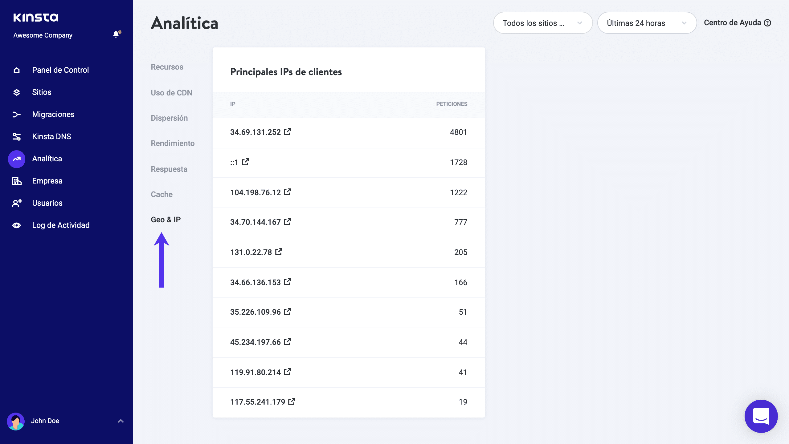 En el panel de control de análisis de MyKinsta puedes ver una lista de las principales direcciones IP que han accedido a tu sitio. Dirígete a Analítica > Geo & IP y desplázate hacia abajo hasta la sección ‘IPs Principales de Cliente’.