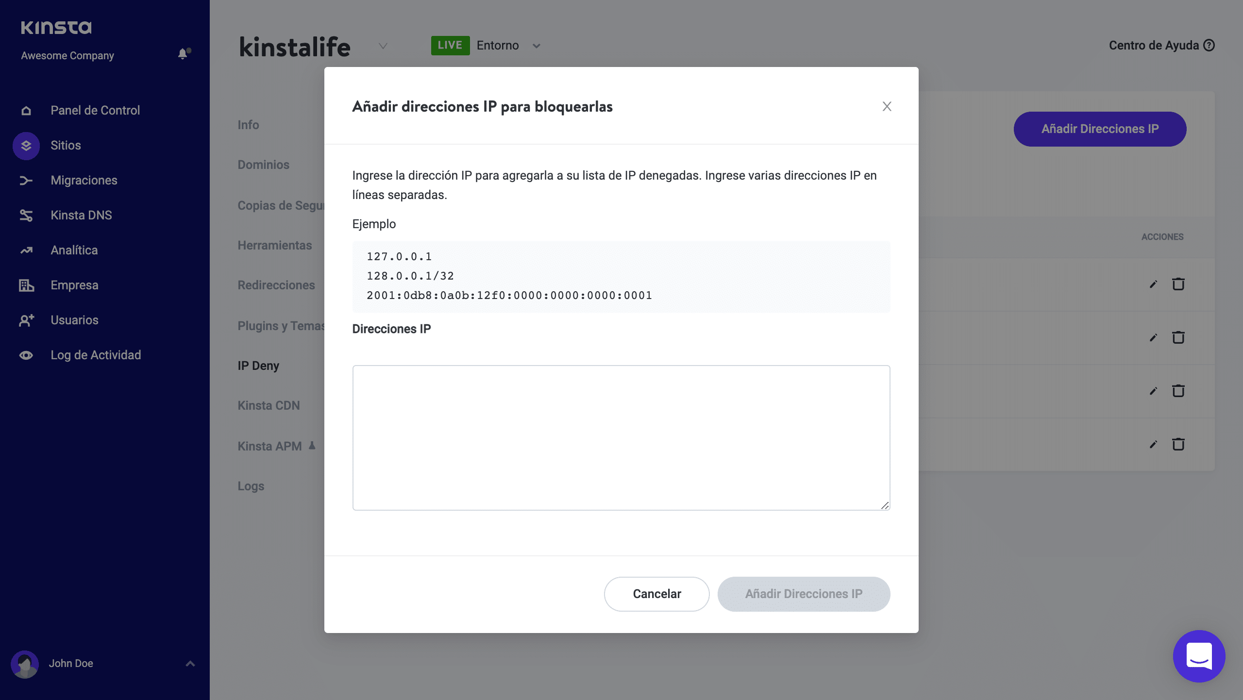 En la ventana modal «Añadir direcciones IP restringidas» puedes añadir direcciones IPV4, direcciones IPV6 y rangos de direcciones IP CIDR (Classless Inter-Domain Routing) a la lista de bloqueo. Los rangos CIDR son útiles para bloquear un rango secuencial de direcciones IP (por ejemplo, de 127.0.0.1 a 127.0.0.255). Para generar un rango CIDR válido, recomendamos utilizar una herramienta como ésta.