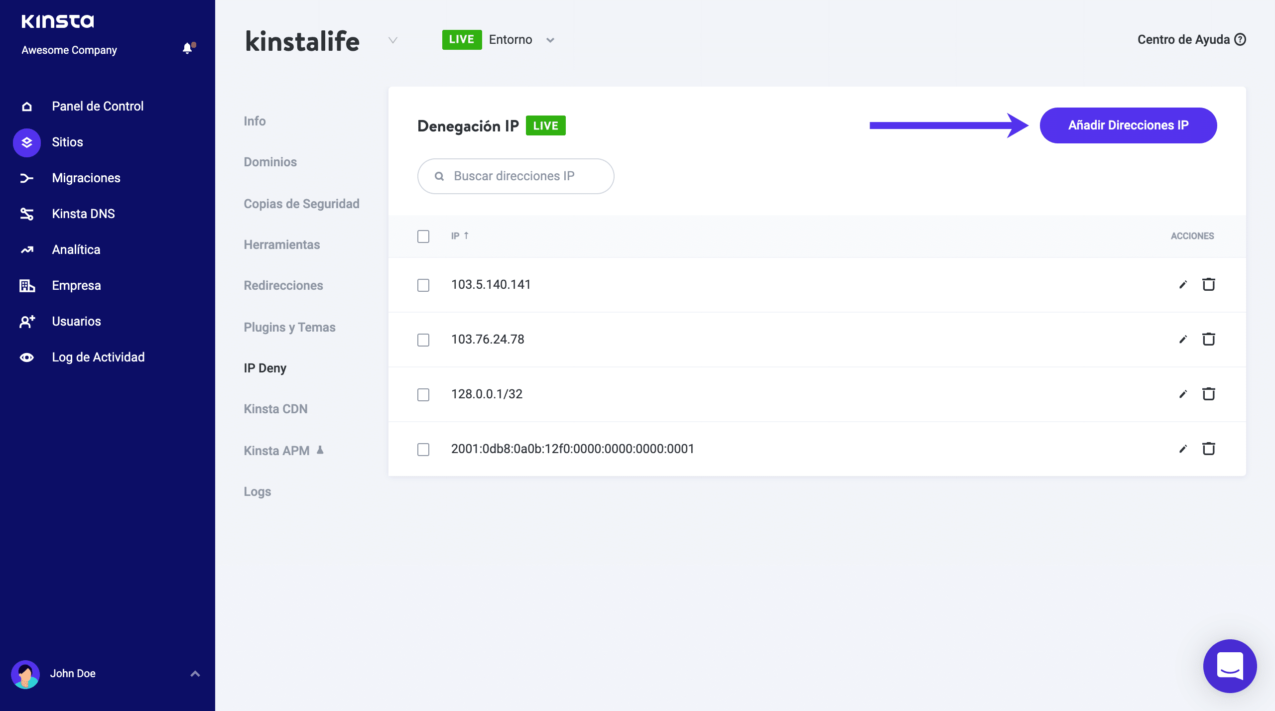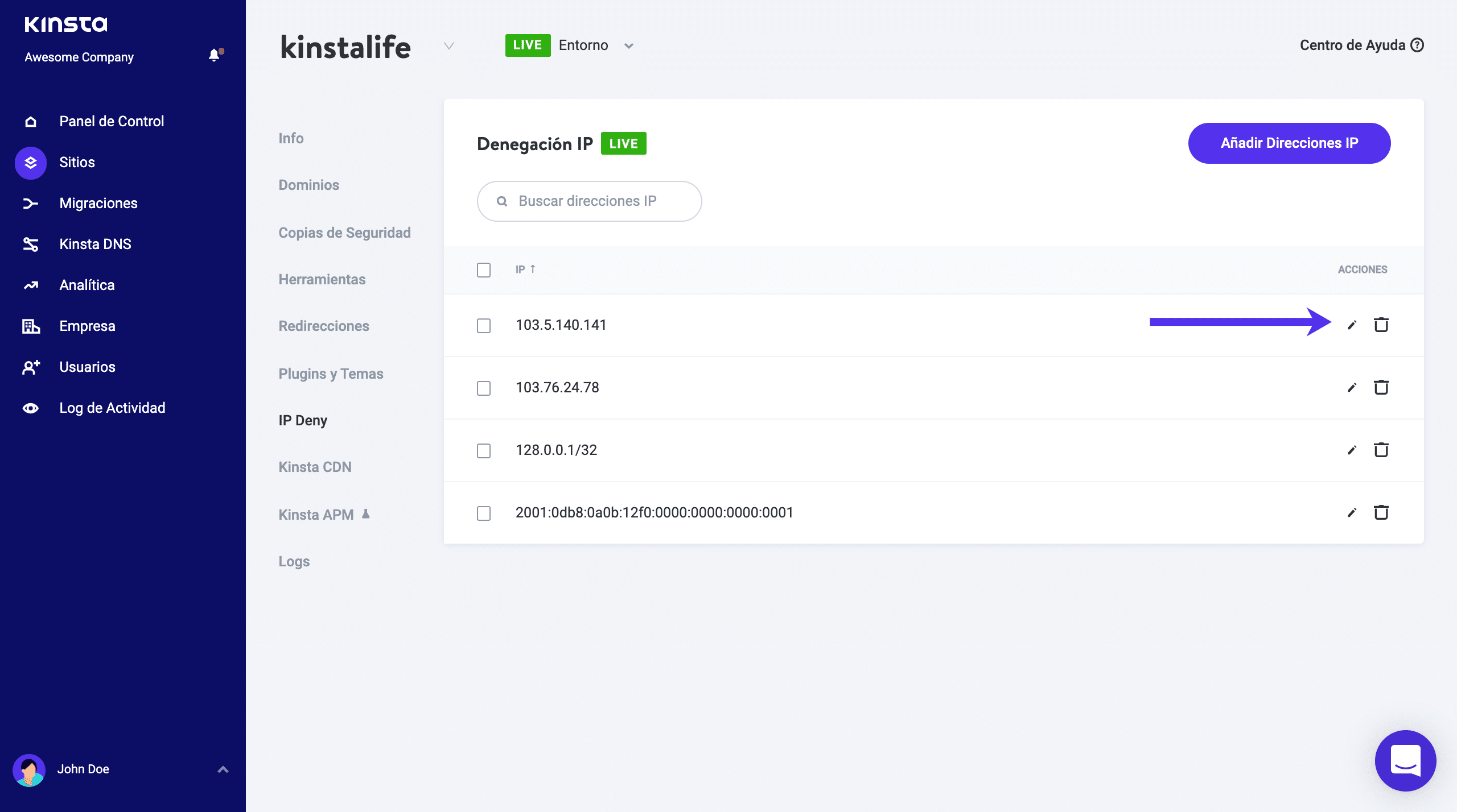 Verás las direcciones IP que se han añadido a tu lista de bloqueo. En esta página, puedes acceder a dos acciones «Editar» y «Eliminar» desde la columna «Acciones». Editar te permite actualizar las direcciones IP y los rangos. La acción «Eliminar» permite borrar las direcciones IP bloqueadas.