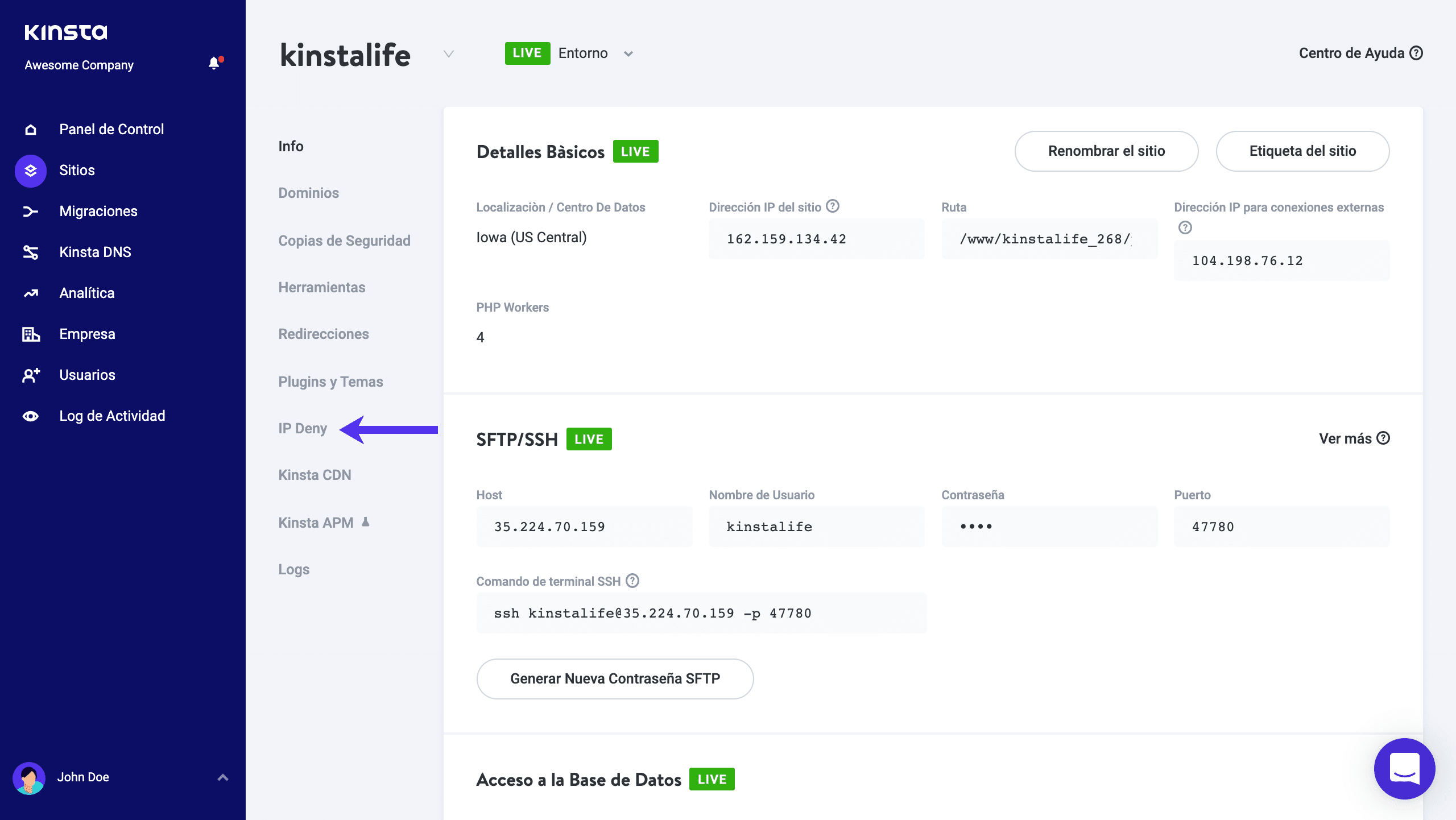 Para bloquear una dirección IP en MyKinsta, dirígete a Sitios > Tu Sitio > IP Deny.