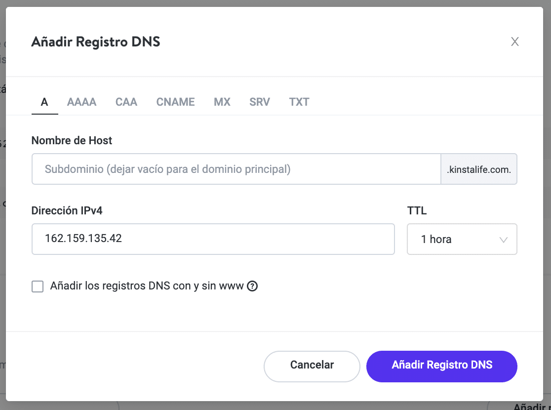 • Agregue la dirección IPv4 de Kinsta en el campo de dirección IPv4.