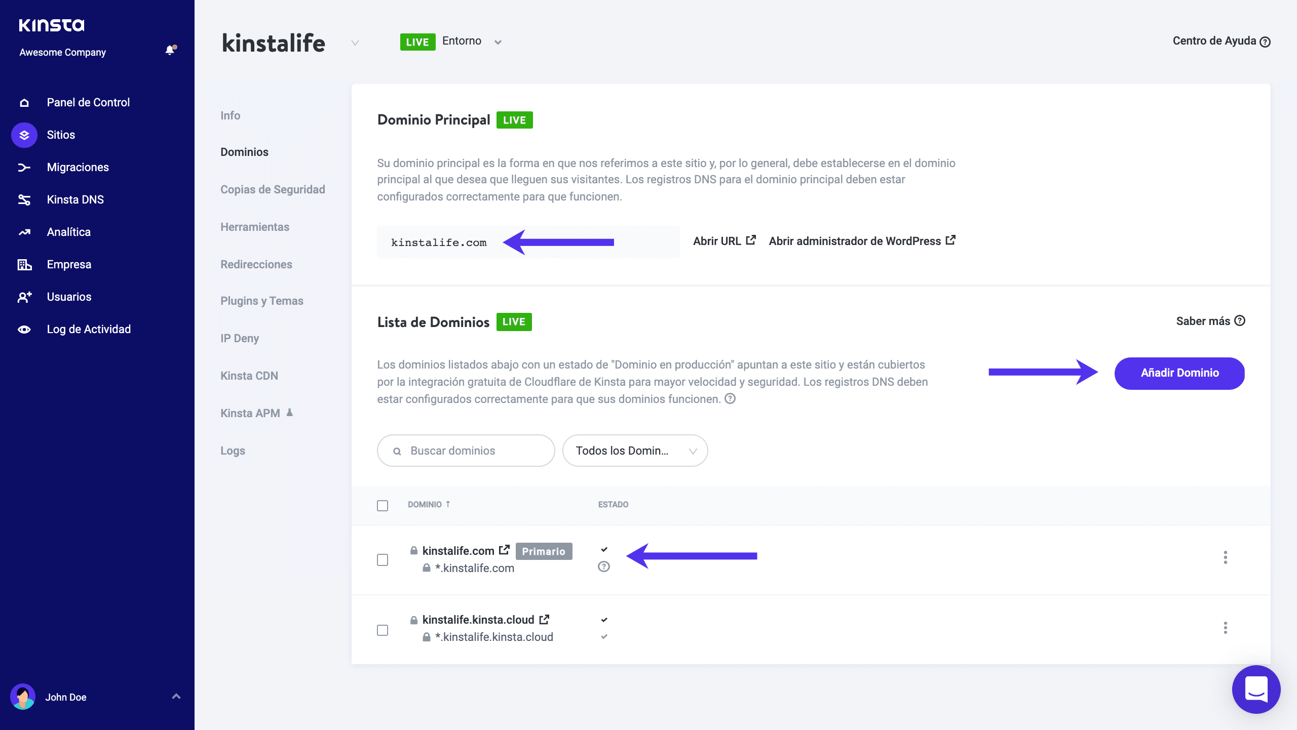 Lo primero que tiene que hacer es asegurarse de que haya agregado su dominio A al dashboard de MyKinsta bajo la sección de Dominios de su sitio web. Usualmente, usted necesitará agregar su dominio primario (sin-www) y la versión www, o viceversa.