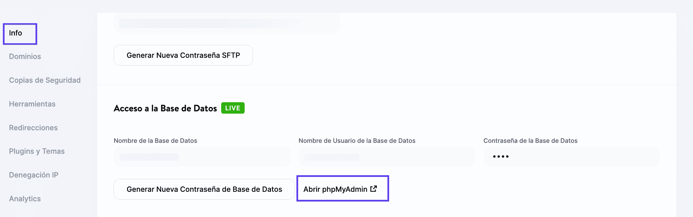 Info > Abrir phpMyAdmin en MyKinsta
