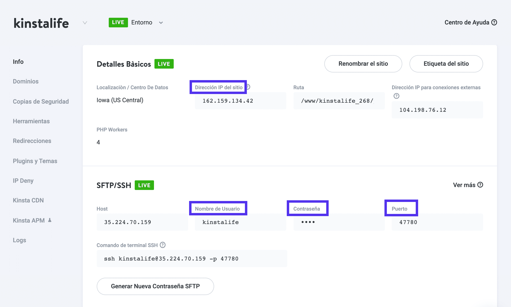 Como cliente de Kinsta, puede hacerlo accediendo a la pestaña de información de su sitio web en el panel de control MyKinsta: