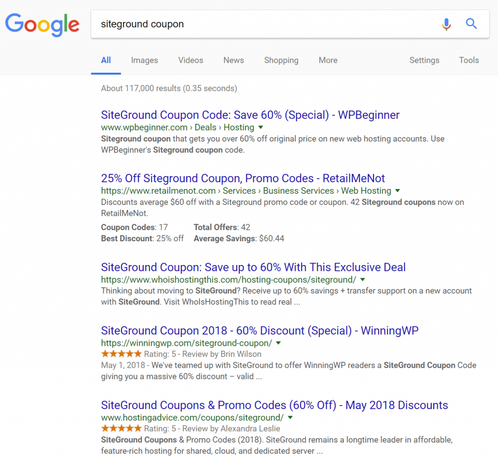 Si usted se pone a buscar un cupón de alguno de nuestros competidores, probablemente verá cientos de resultados que se extienden por varias páginas. El problema de lidiar con tantos cupones de 60% (como se puede ver abajo) es que los planes de estas compañías no están basando en un servicio de calidad, simplemente es una estrategia de mercadeo. En Kinsta, preferimos ser honestos, transparentes y ofrecerle el mejor precio.