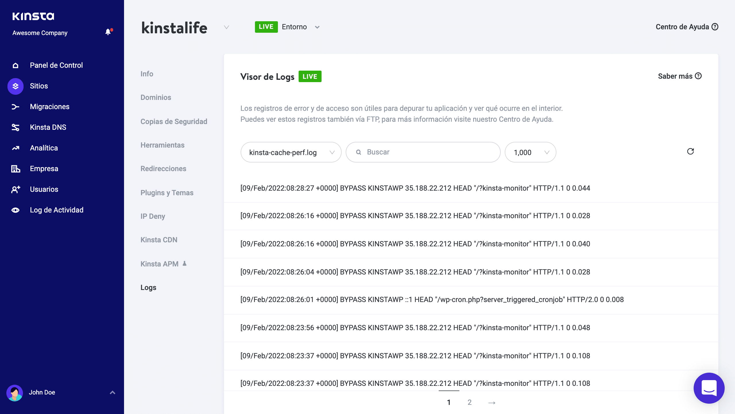 Simplemente haga clic en uno de sus sitios WordPress y haga clic en «Logs». Ahora podrá ver sus archivos error.log, kinsta-cache-perf.log y access.log. Por defecto ahora mostrará las últimas 1.000 líneas (los sellos de tiempo se muestran en UTC). Mediante la barra deslizante podrá ver las últimas 20.000 líneas.