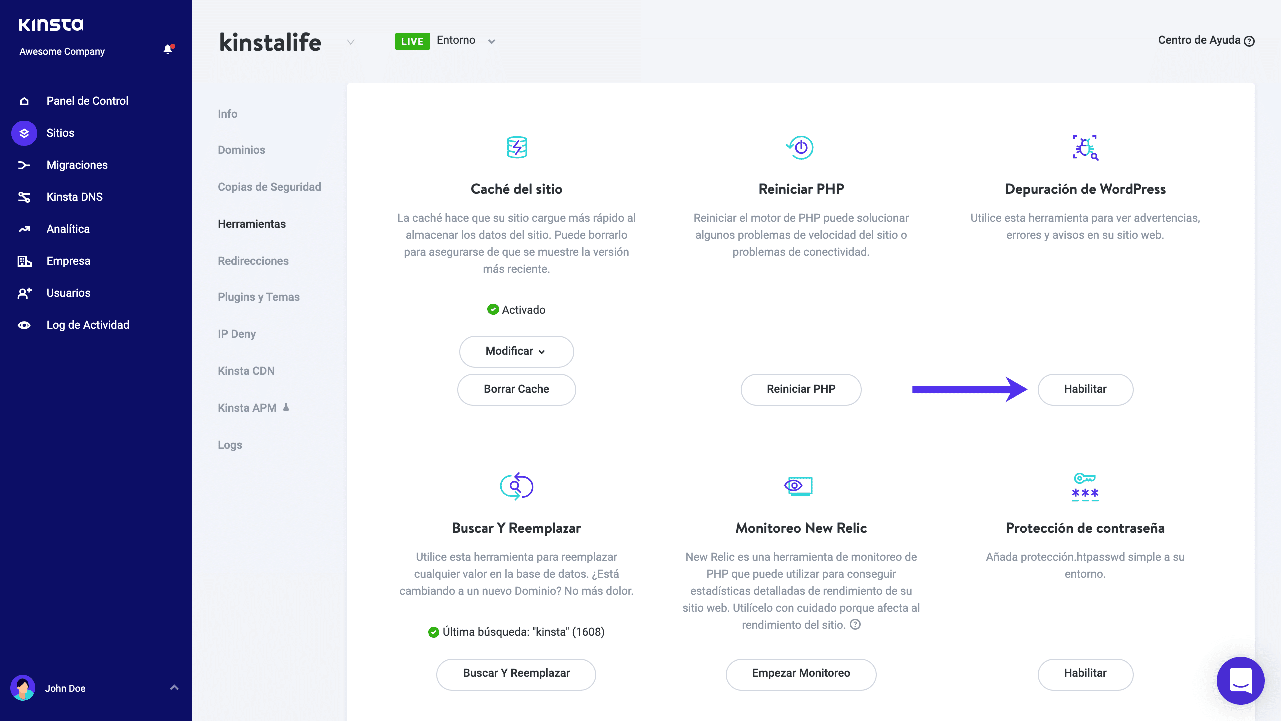 Para los usuarios de Kinsta, se puede activar el modo de depuración de WordPress directamente en el panel de control de MyKinsta. Simplemente navega a Sitios > Herramientas > Depuración de WordPress, y haz clic en el botón «Activar». Esto te permitirá ver los errores y avisos de PHP sin tener que habilitar el modo de depuración a través de SSH o SFTP.