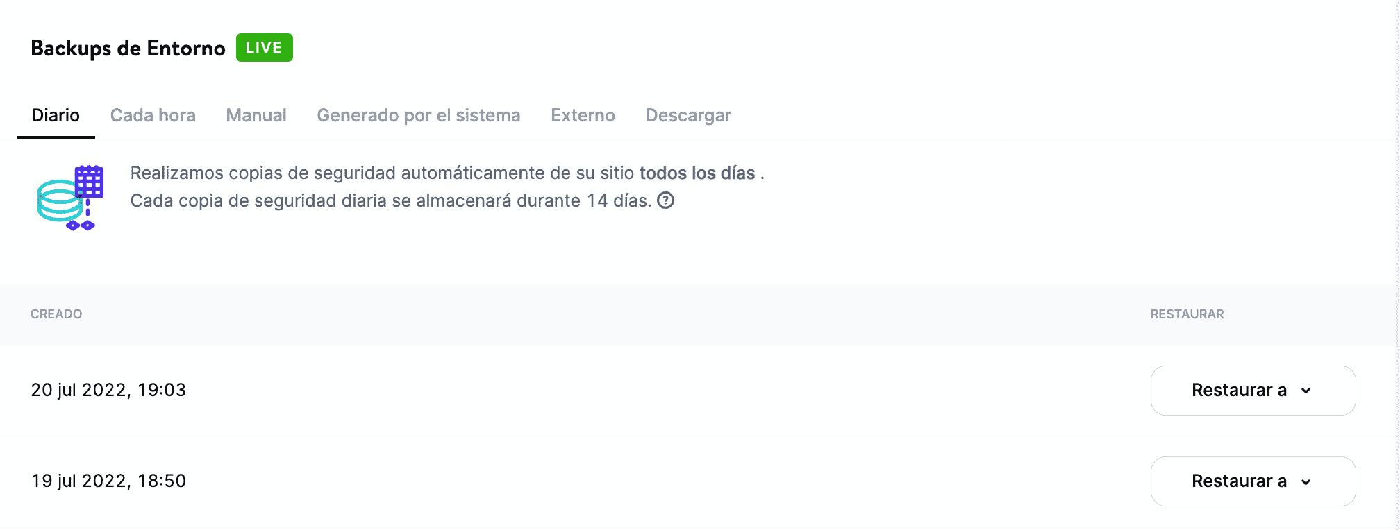 Si necesitas eliminar una tabla de la base de datos, es recomendable que hagas primero una copia de seguridad de toda la base de datos. Dependiendo de tu alojamiento web, puedes tener acceso a copias de seguridad automáticas. Kinsta, por ejemplo, hace una copia de seguridad completa de tu sitio web cada día: