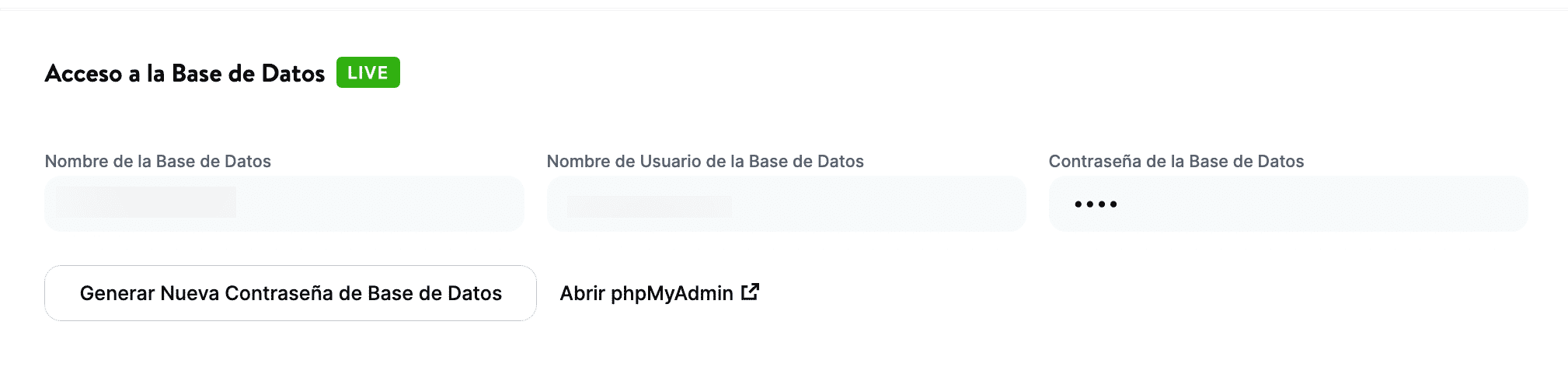 Si utilizas Kinsta, puedes acceder al panel de control de MyKinsta y navegar hasta la pestaña Información de tu sitio. Dentro, encontrarás una sección que dice Acceso a la base de datos. Haz clic en el botón que dice Abrir phpMyAdmin: