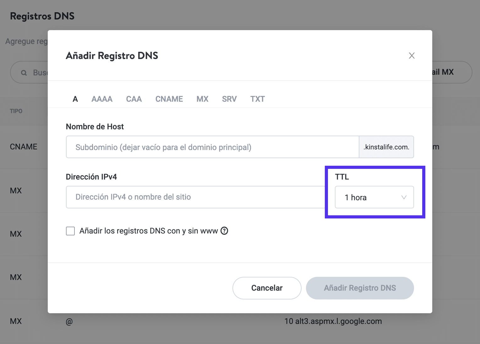 Navega hasta Kinsta DNS y añade tu dominio. Haz clic en el dominio elegido para añadir y ver los registros DNS. Desde ahí, puedes hacer clic en Añadir un registro DNS > TTL.