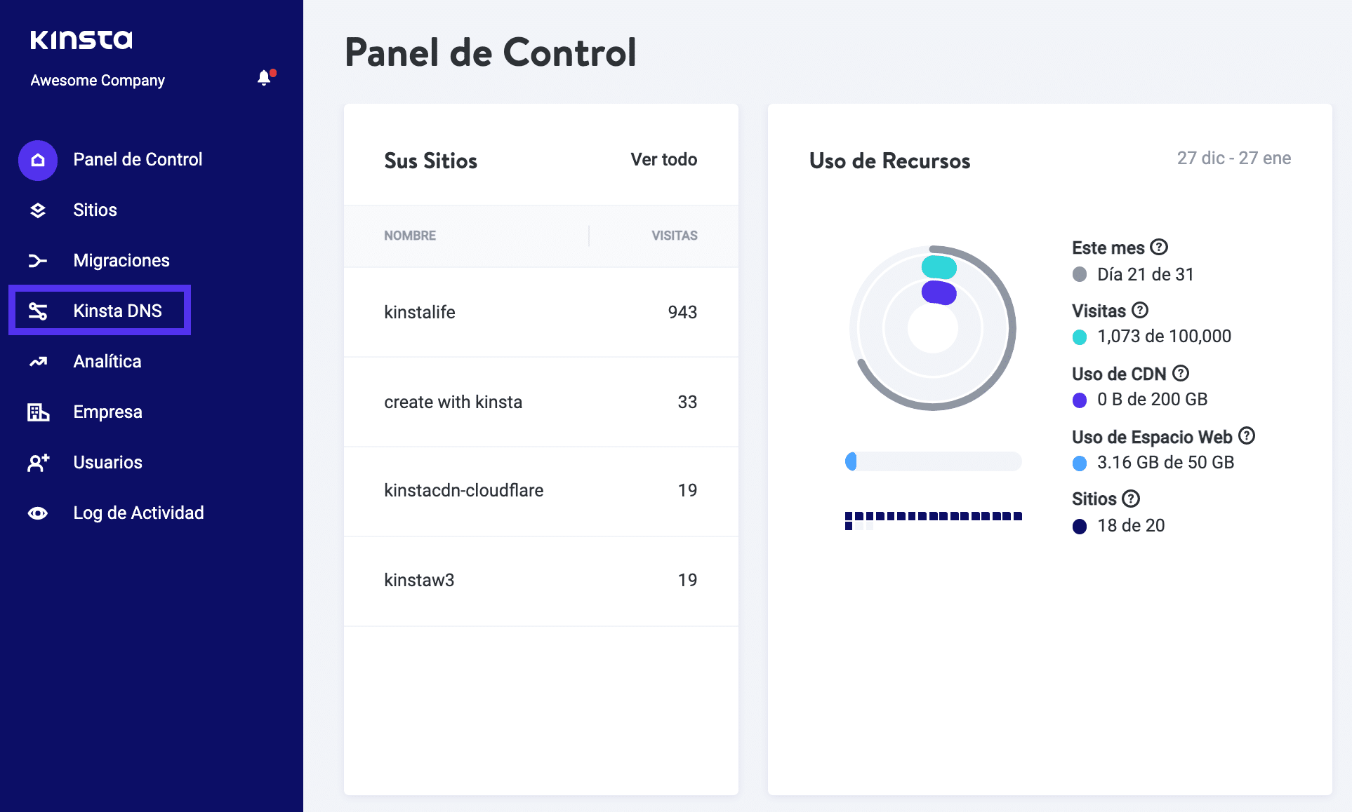 Puedes cambiar el TTL de tus registros DNS muy fácilmente con Kinsta. Esta configuración personalizable está disponible con el menú DNS de Kinsta en la barra lateral de tu panel de control de Kinsta.