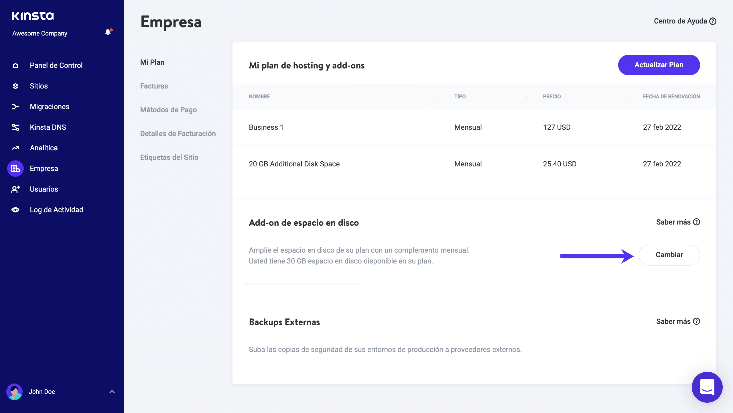 Queremos que tenga la mayor flexibilidad posible en Kinsta, así que lanzamos nuestro complemento de espacio en disco. Ahora puede aumentar el espacio de almacenamiento de su plan de hosting con unos pocos clics. ¿Necesita 100 GB de almacenamiento en un plan Pro? No hay problema, lo tenemos cubierto.