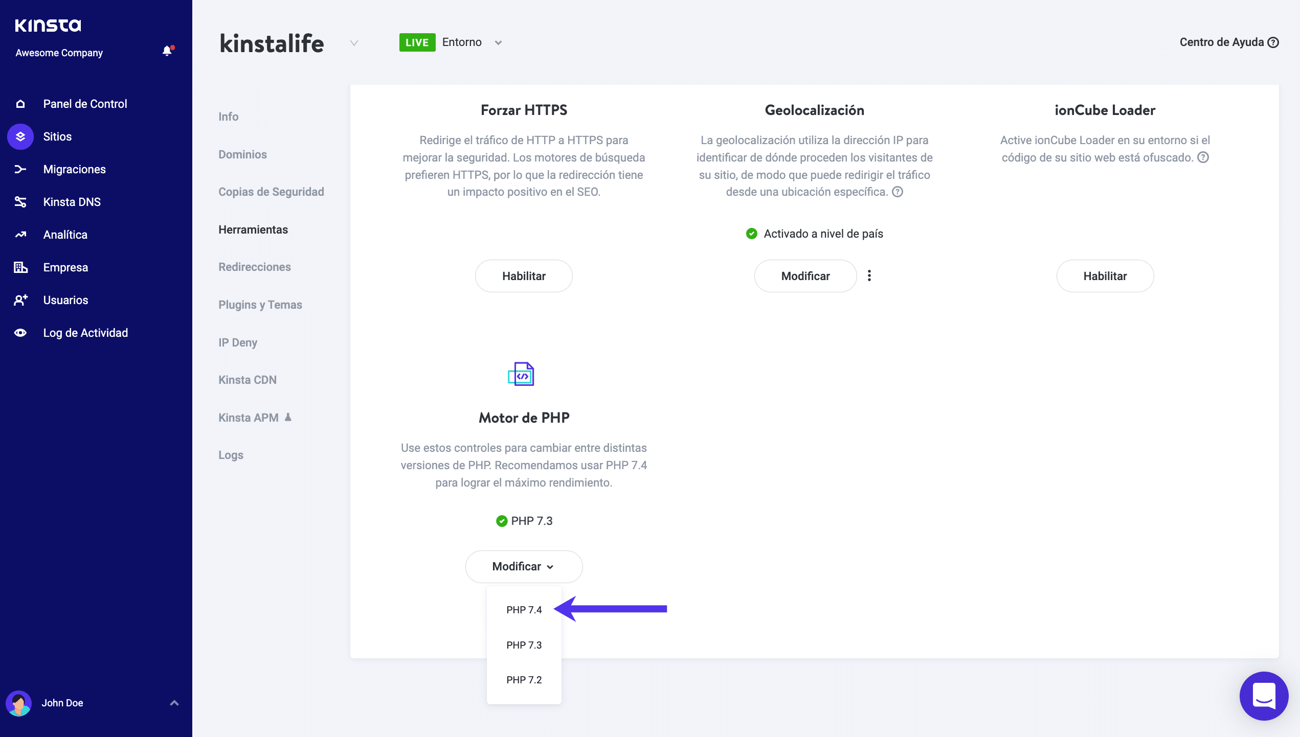 PHP 7.4 fue lanzado para disponibilidad general (GA) el 28 de noviembre de 2019 y Kinsta fue uno de los primeros proveedores de hosting (no sólo específico de WordPress) en ponerlo a disposición de todos! Puede cambiar a ella con un solo clic en el panel de control de MyKinsta.