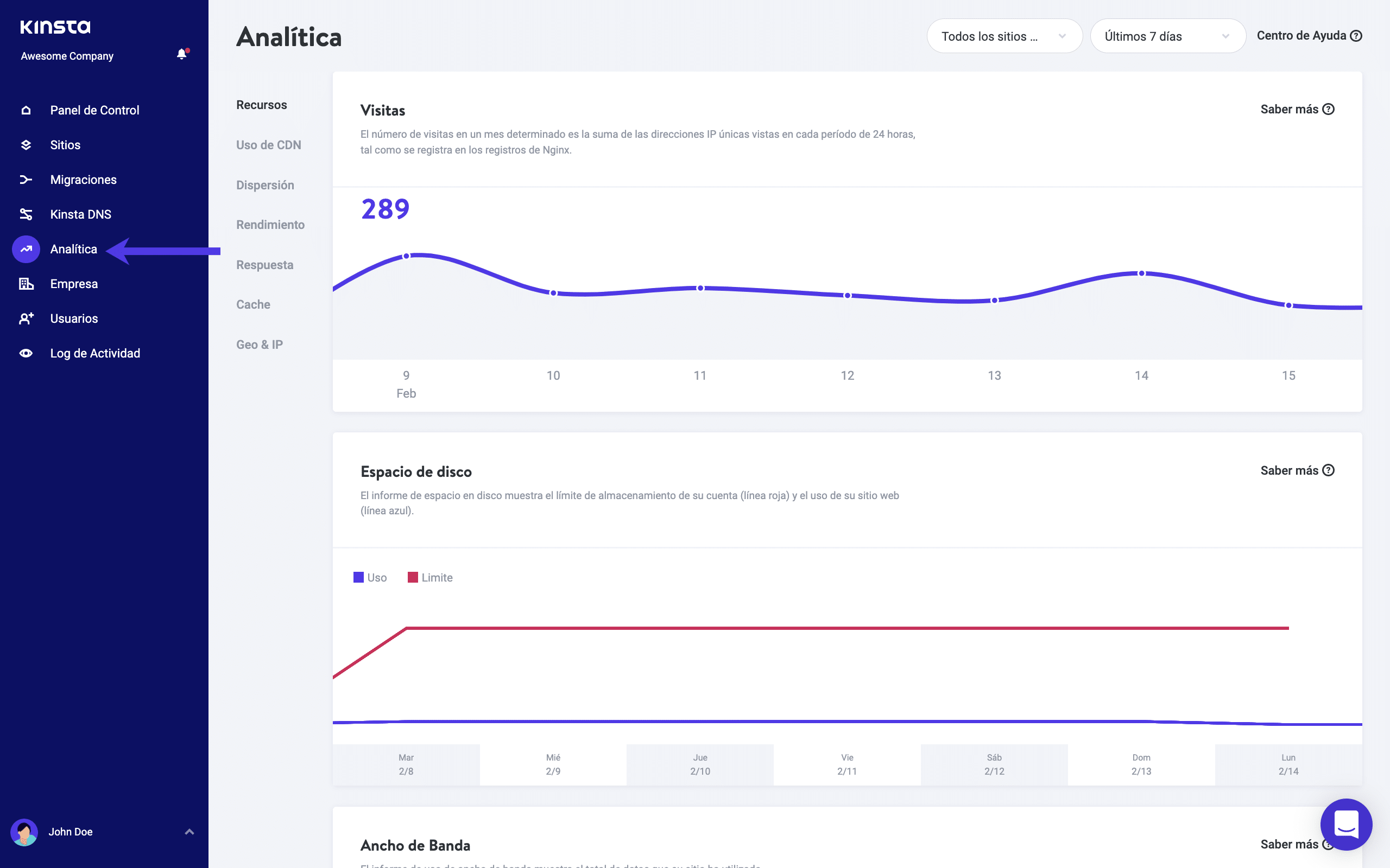 Puedes mirar el tráfico de tu servidor y los análisis para ver si puedes detectar algún patrón irregular en el tráfico del sitio. Si utilizas Kinsta para alojar tu sitio, puedes ver estos datos fácilmente yendo a tu panel de control MyKinsta Analytics.