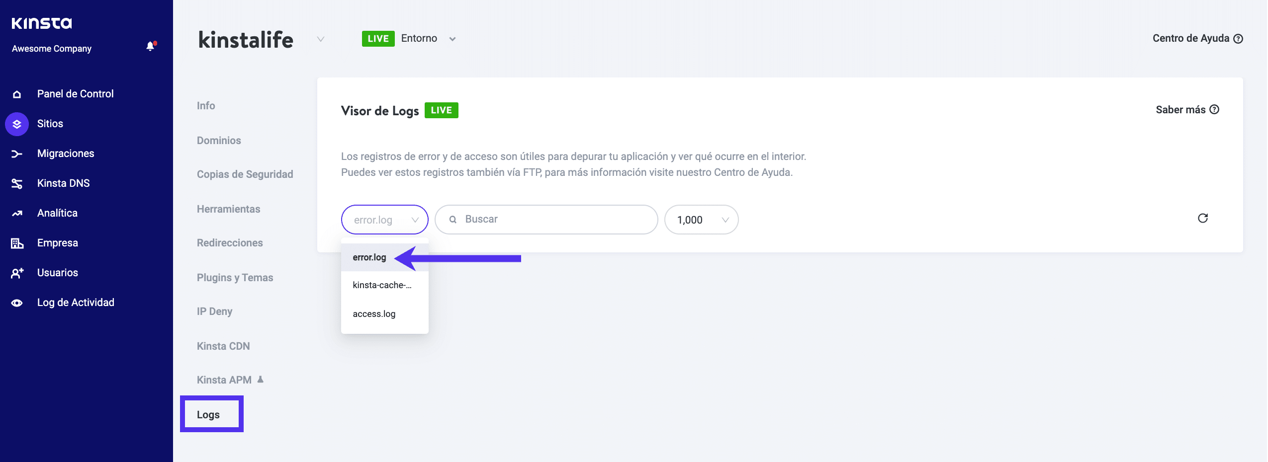 Si eres cliente de Kinsta, puedes ver fácilmente los errores en el visor de registros de tu panel de control MyKinsta.