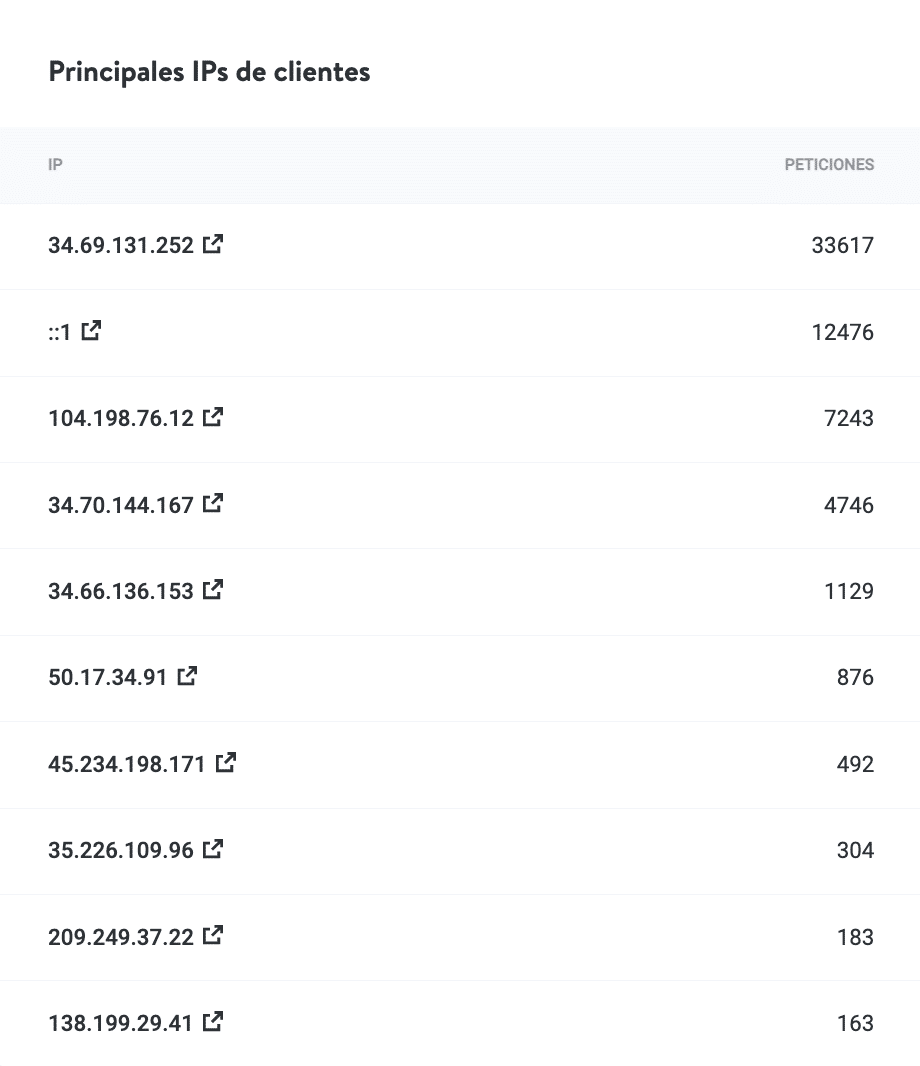 Comienza tu investigación mirando los IP de los clientes más importantes. Te dará una idea de quién está generando el máximo número de solicitudes, y desde dónde. Si tu servidor de repente consume un enorme ancho de banda o atrae mucho tráfico, entonces este reporte te será muy útil.