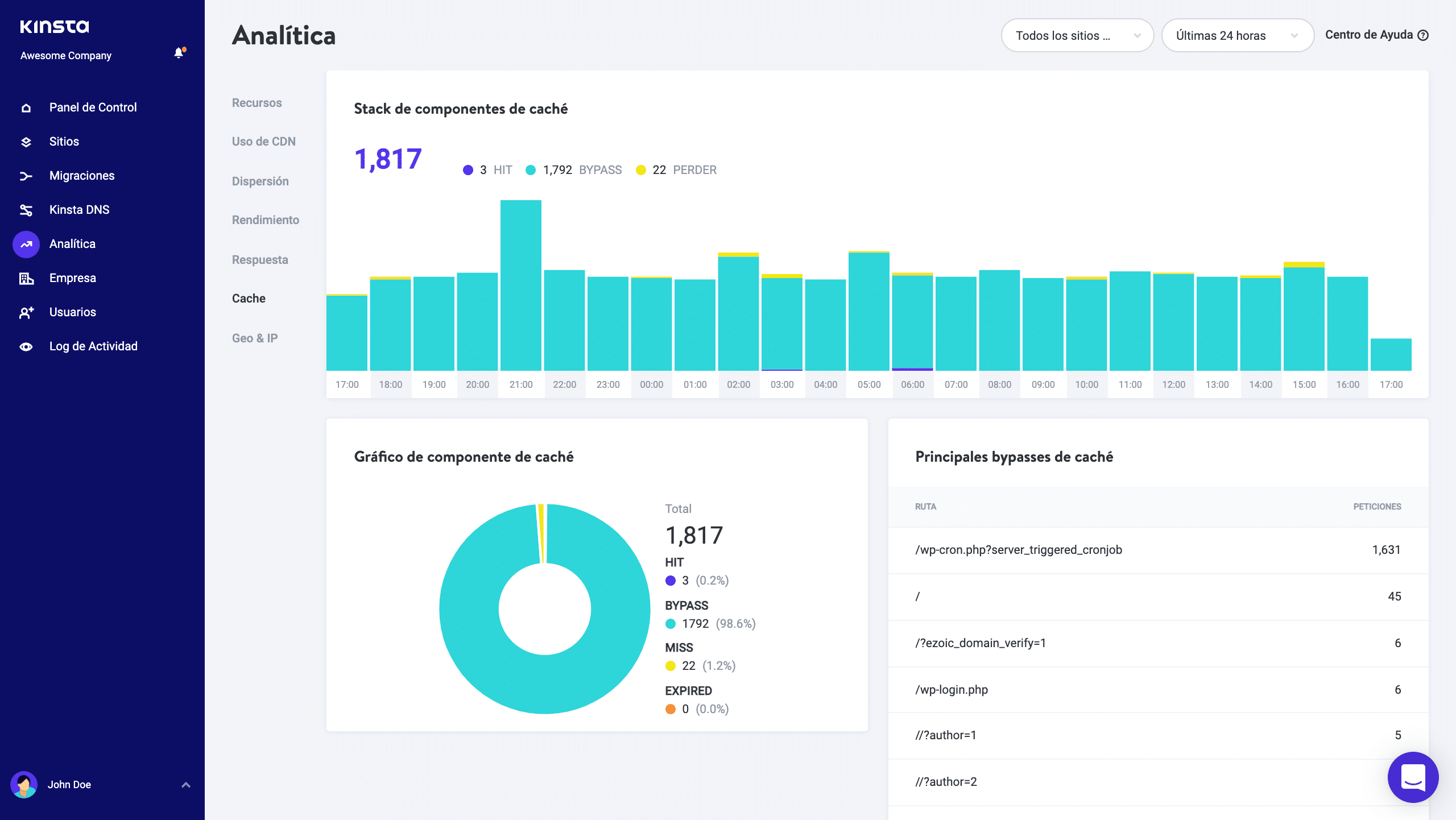 Debajo de la sección de análisis de caché, usted podrá ver cuantas peticiones están siendo servidas directamente desde el caché, bypassing el caché, faltantes, expiradas, etc.