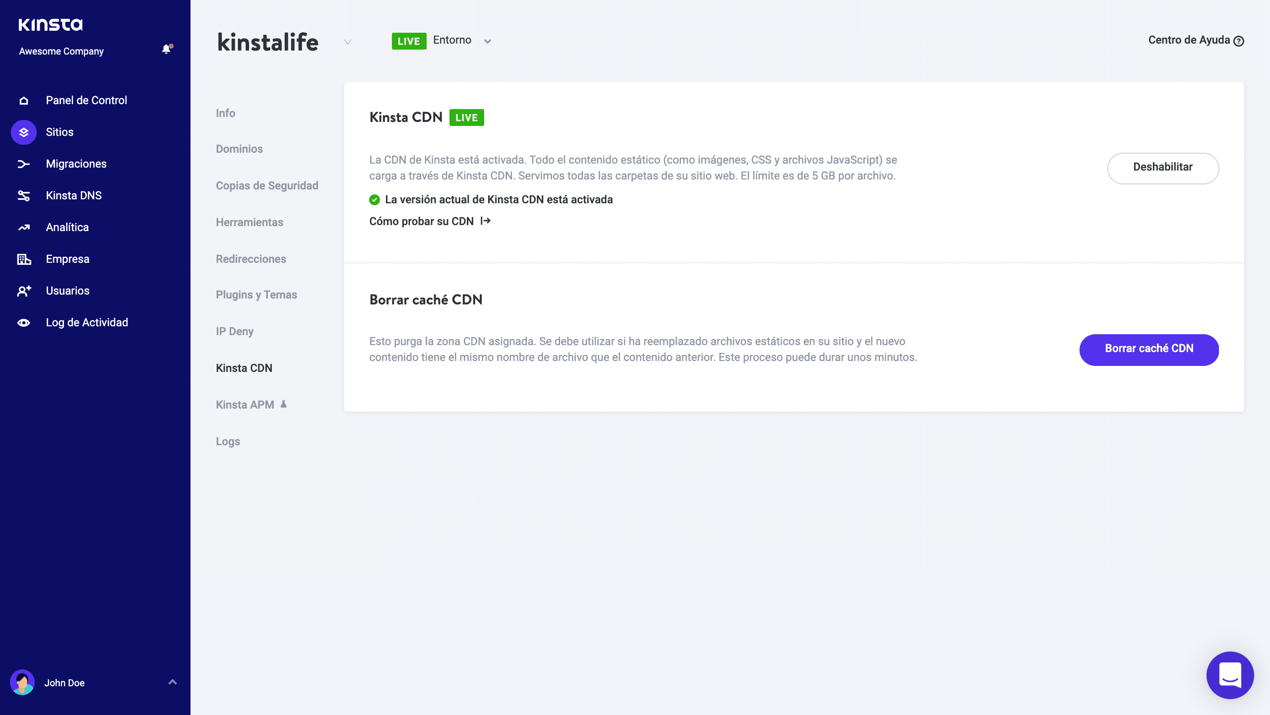 Desde la versión 2 del dashboard, nos hemos asociado con KeyCDN, una red de entrega de contenido por HTTP/2 y con opción de IPv6, con 200+ ubicaciones, para turbo cargar su contenido y multimedia alrededor del mundo. En nuestra experiencia, un CDN típicamente puede ayudarle a reducir por un 70% su ancho de banda todas las peticiones de su web host y en algunos casos ¡reducir los tiempos de carga hasta por un 50%! Puede habilitar el Kinsta CDN con tan sólo dar un clic en el dashboard de MyKinsta.