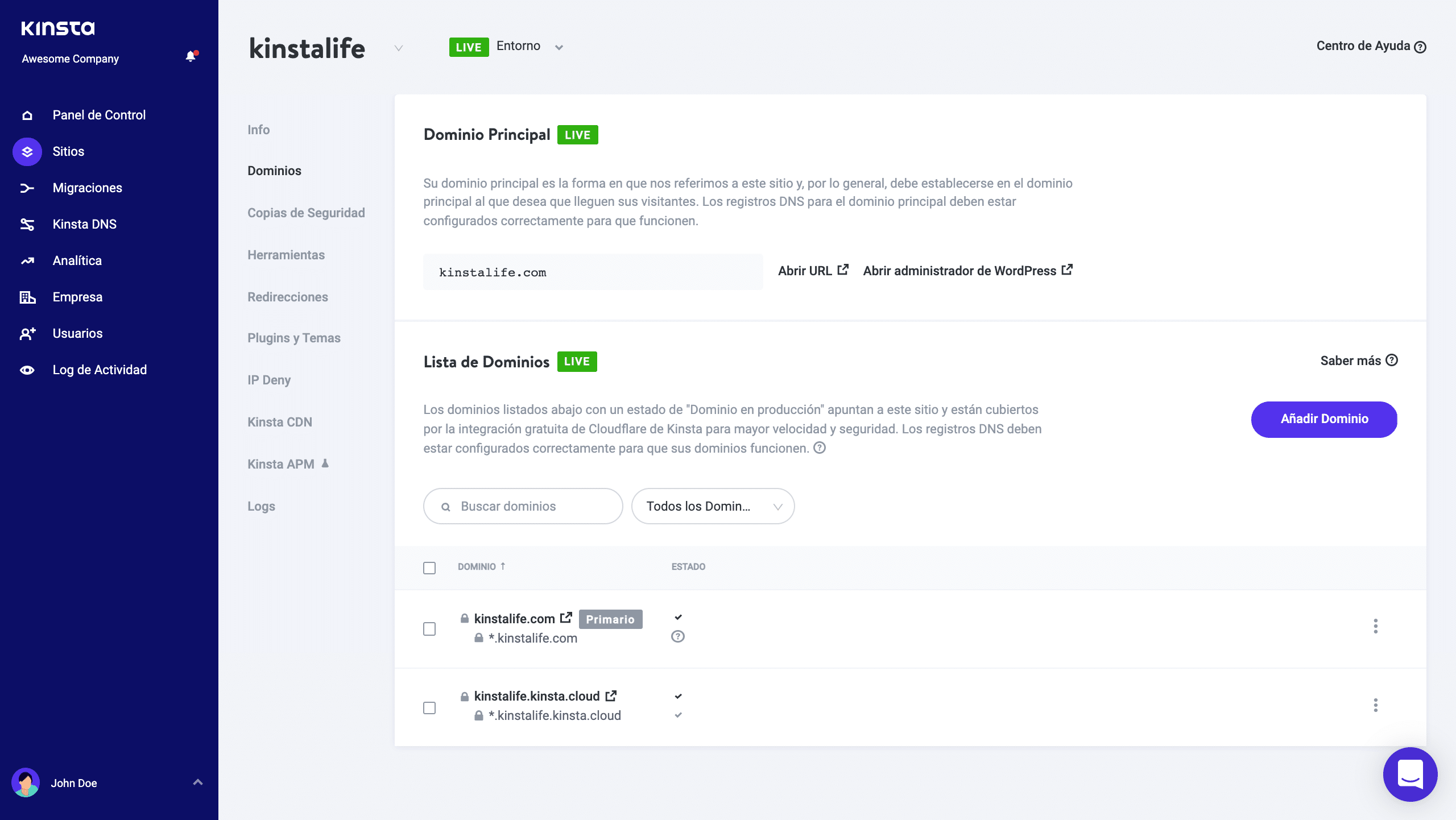 La siguiente sección de su sitio de WordPress es la pestaña de “Dominios”. Aquí podrá agregar su dominio principal y adicional. Puede establecer su dominio principal que es la forma de la que nos referimos a su sitio. Los registros de DNS para el dominio principal deben ser establecidos correctamente para que funcionen. Si usted no elige agregar su propio dominio en una nueva instalación, usted verá su URL temporal de Kinsta (susitio.kinsta.cloud). También hay un enlace para abrir su admin de WordPress.