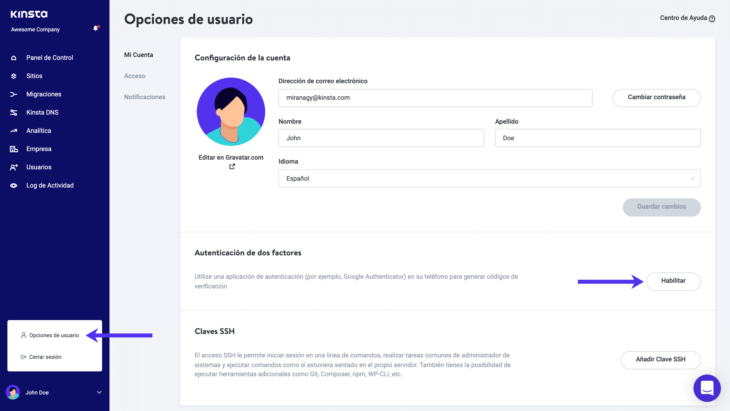 Por último, pero no menos importante, usted puede habilitar la autentificación de dos fases. Esto hace que tu cuenta Kinsta sea más segura al requerir un código de autorización secundario en cada inicio de sesión.