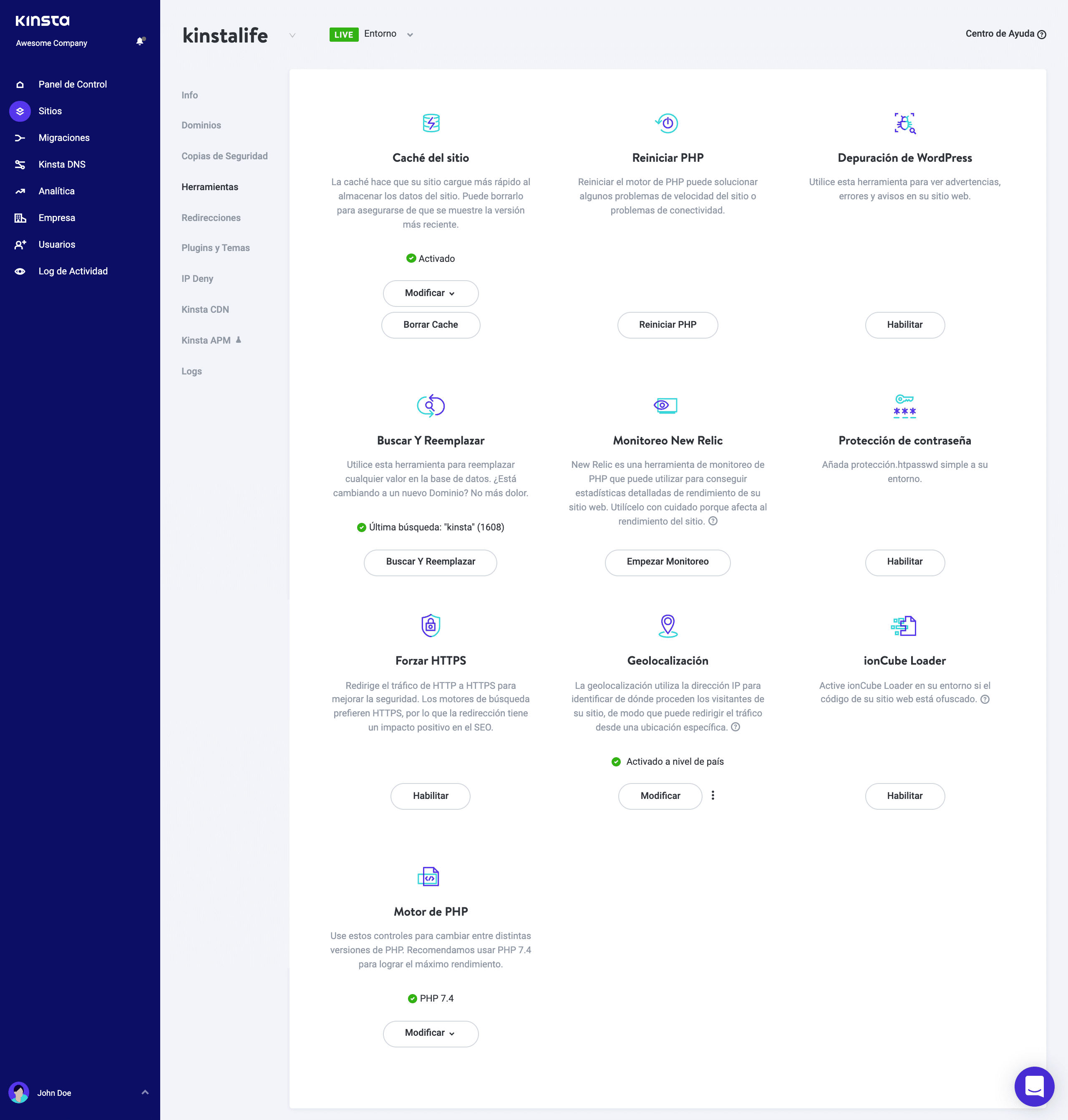 Para aquellos que aún no sean clientes de Kinsta, esto les dará una pequeña vista del detrás de escenas. Cheque algunas de las nuevas opciones, herramientas y áreas en My Kinsta: