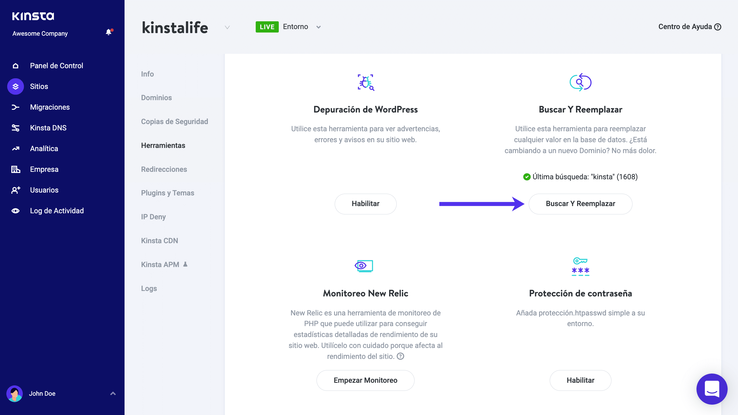 Si eres cliente de Kinsta, puedes usar nuestra herramienta de búsqueda y sustitución, que está disponible en el panel de control MyKinsta.
