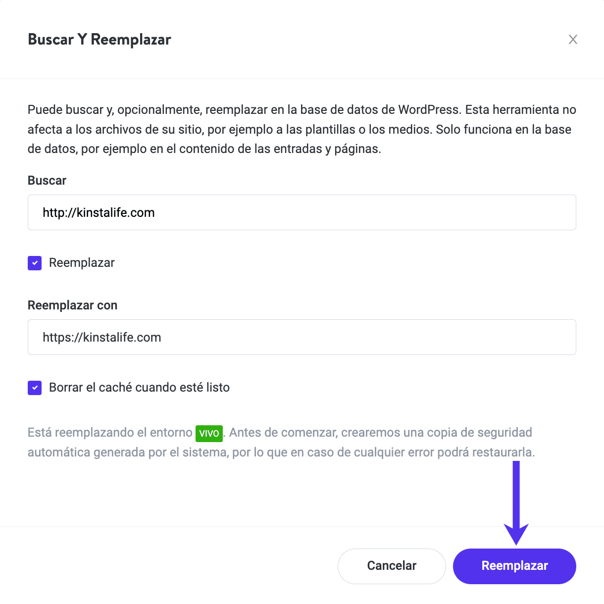Selecciona la casilla Reemplazar para continuar con el proceso de reemplazo. En el campo Reemplazar con, introduce lo que debe reemplazar el valor que estás buscando. En este caso, usaremos nuestro dominio HTTPS: https://kinstalife.com.