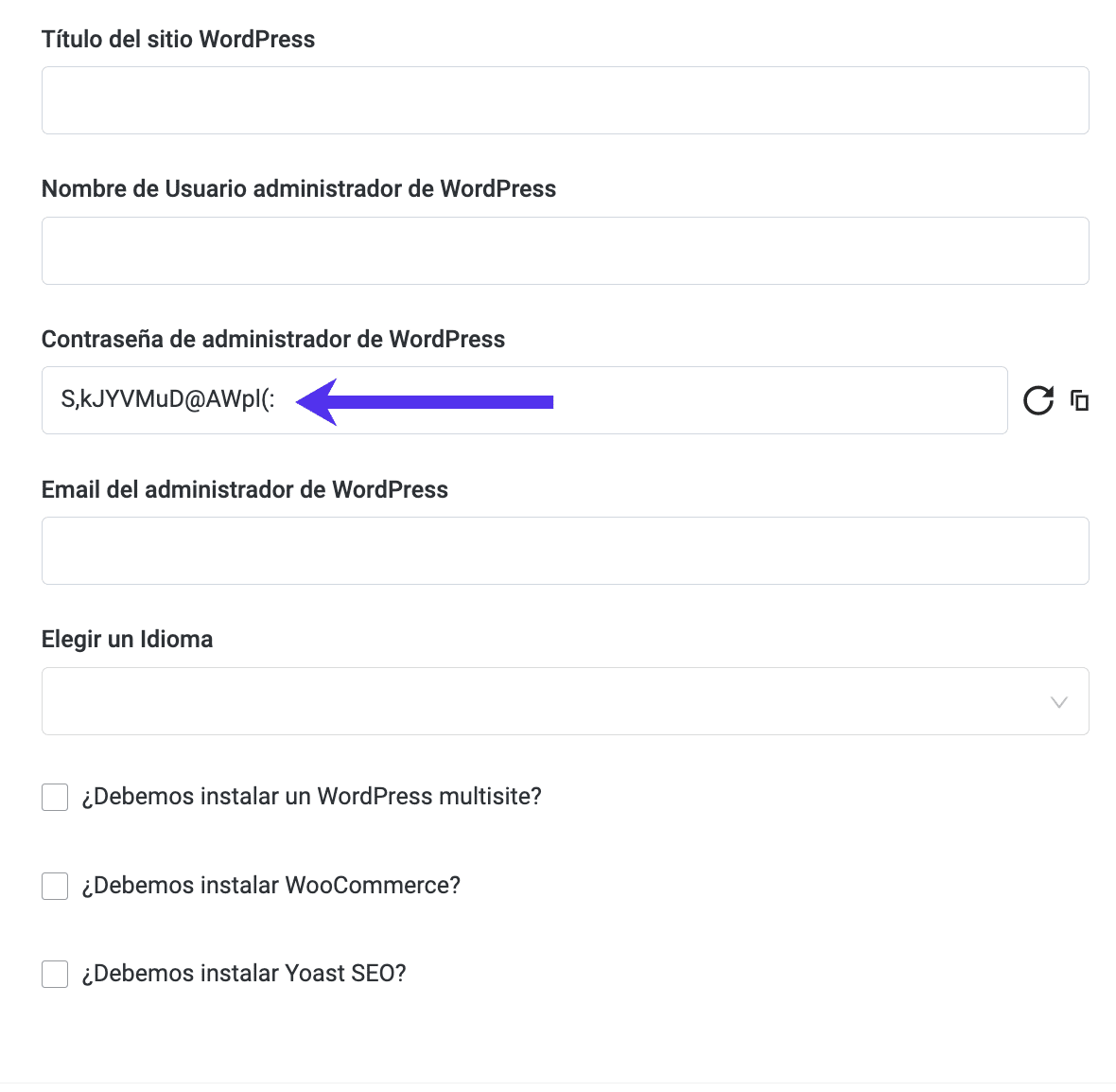 ¡Es correcto! La contraseña más popular es «123456», seguido por un sorprendente «contraseña». Esa es una razón por la cual aquí en Kinsta en cuanto a las nuevas instalaciones de WordPress realmente forzamos una contraseña compleja a ser utilizada para su wp-admin login (como se ve a continuación en nuestro proceso de instalación de un solo clic).