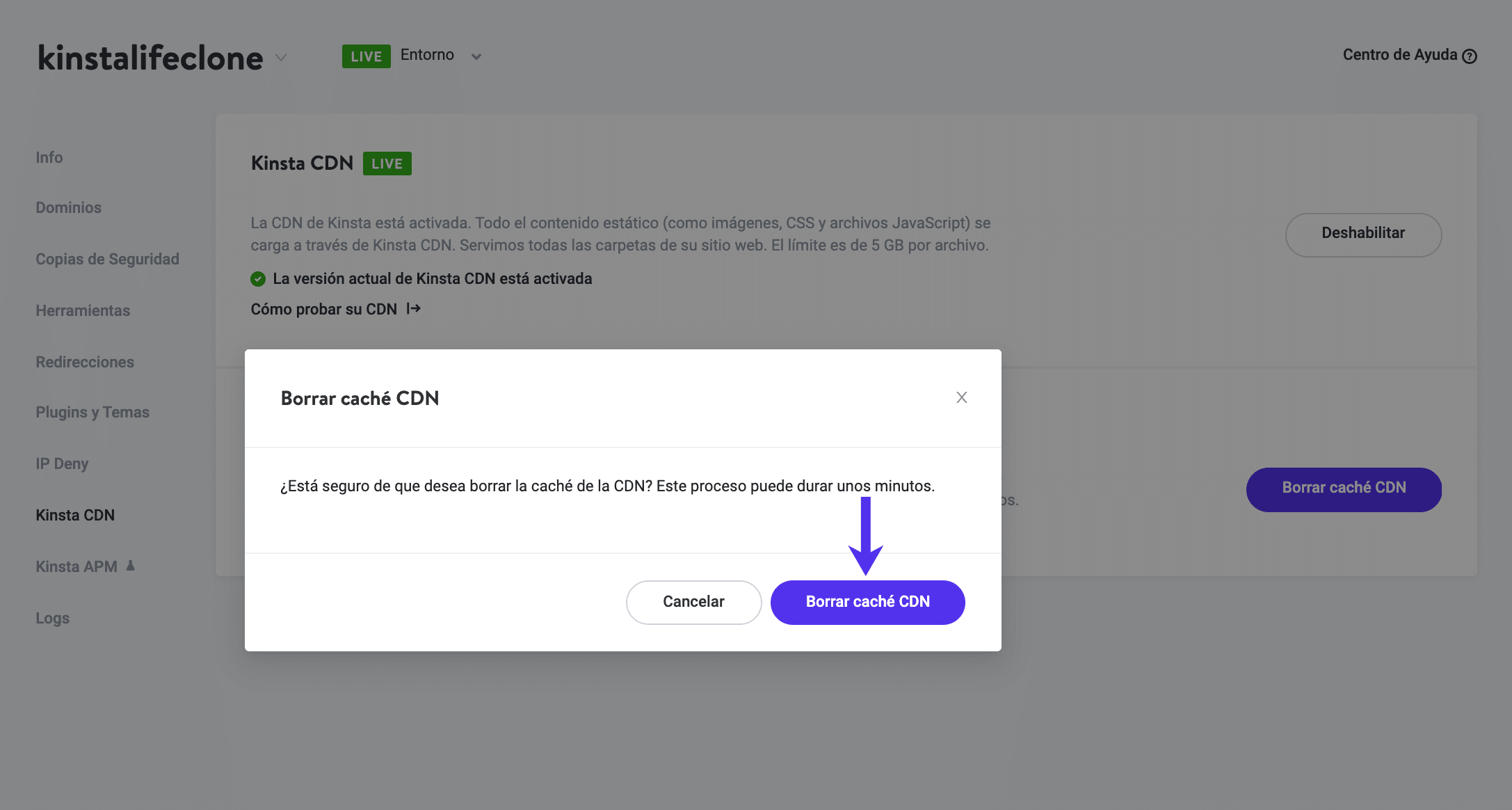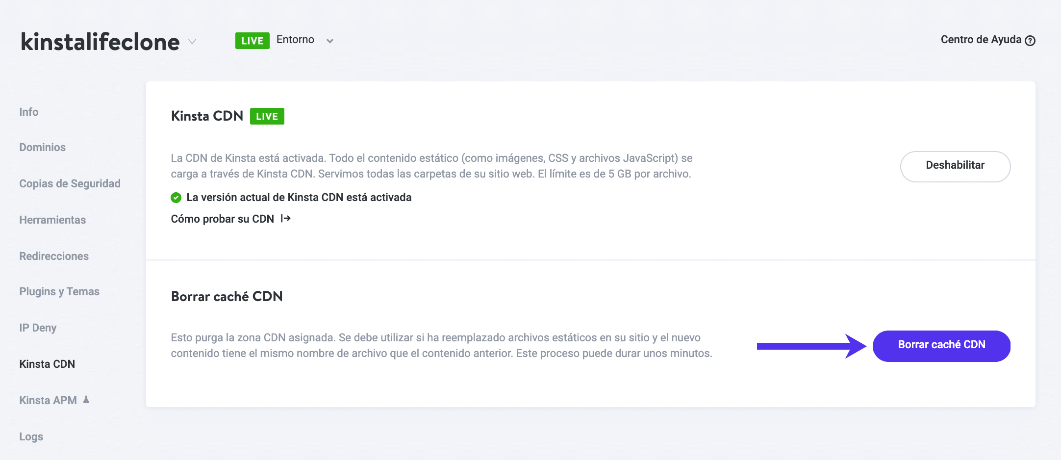 Selecciona el botón Borrar caché CDN.