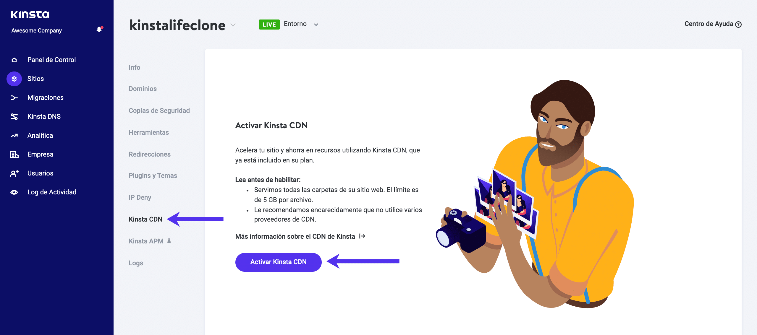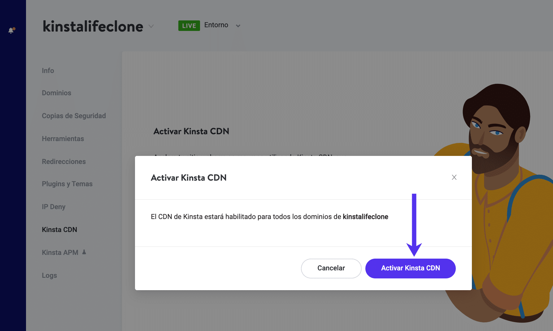 Selecciona el botón Habilitar Kinsta CDN.