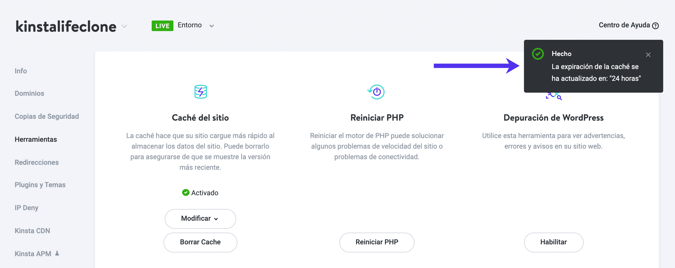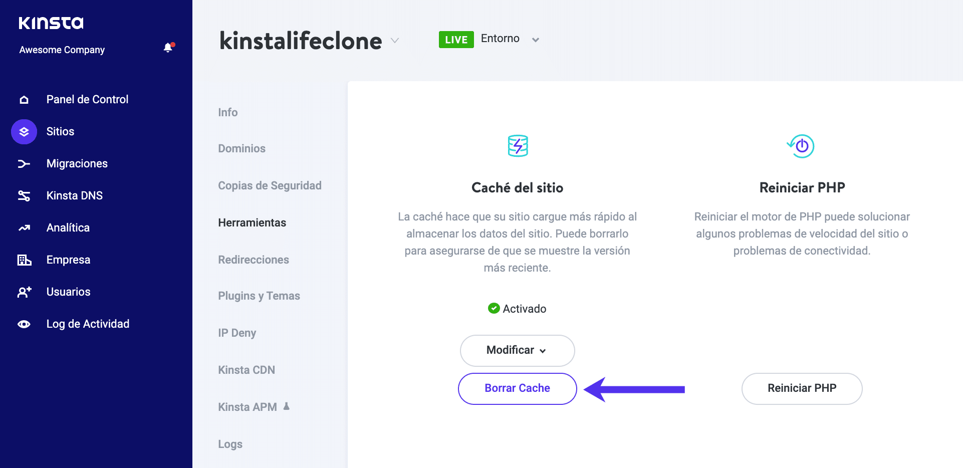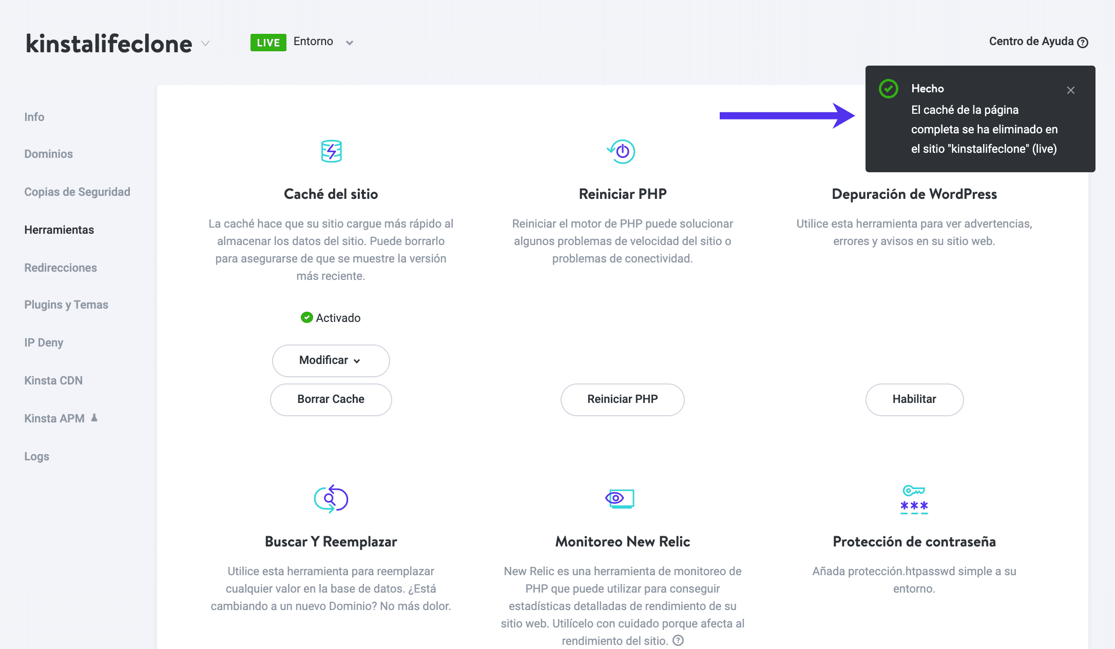 ¿Cómo borrar la caché de WordPress en MyKinsta?