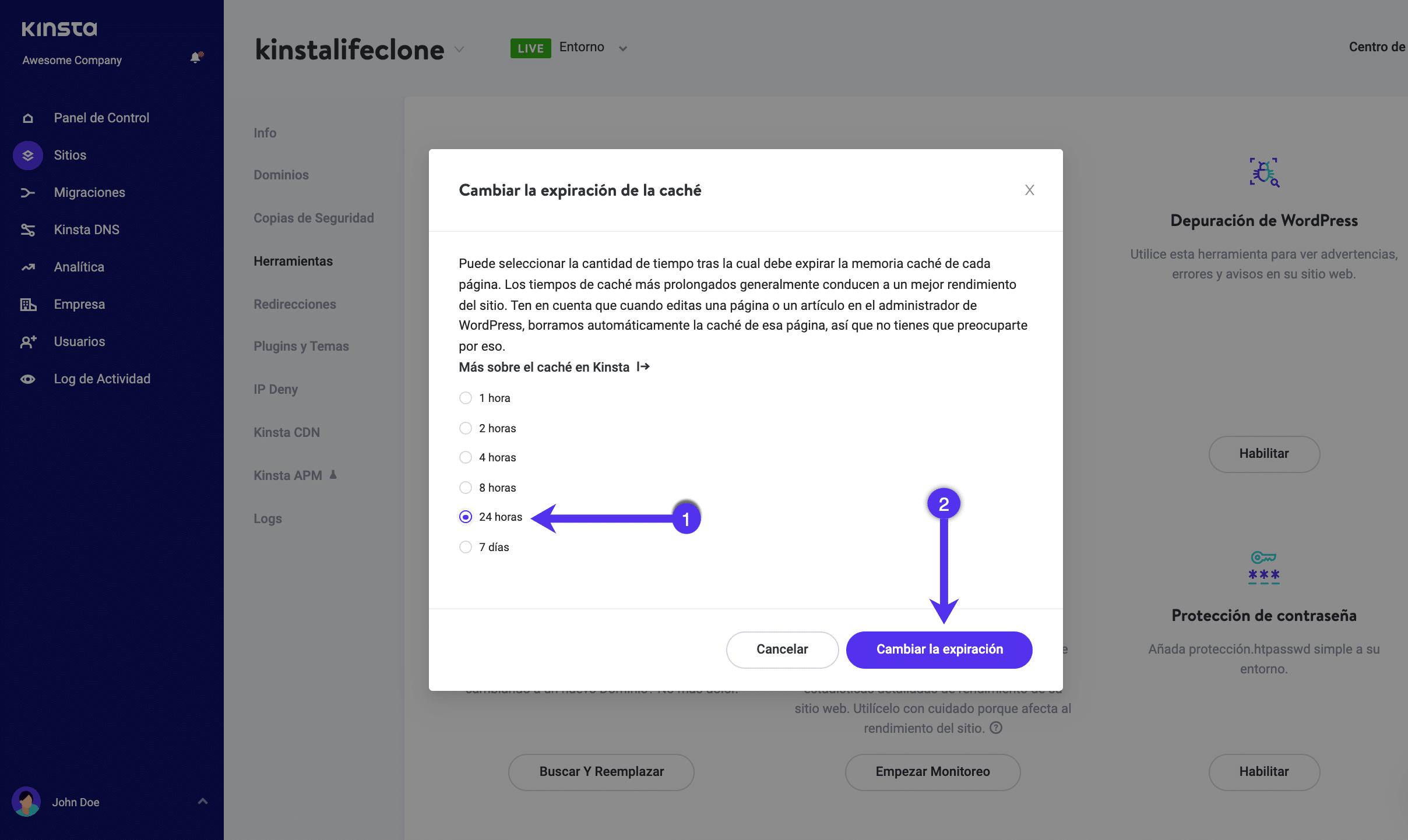 Cambiar la caducidad de la caché en MyKinsta