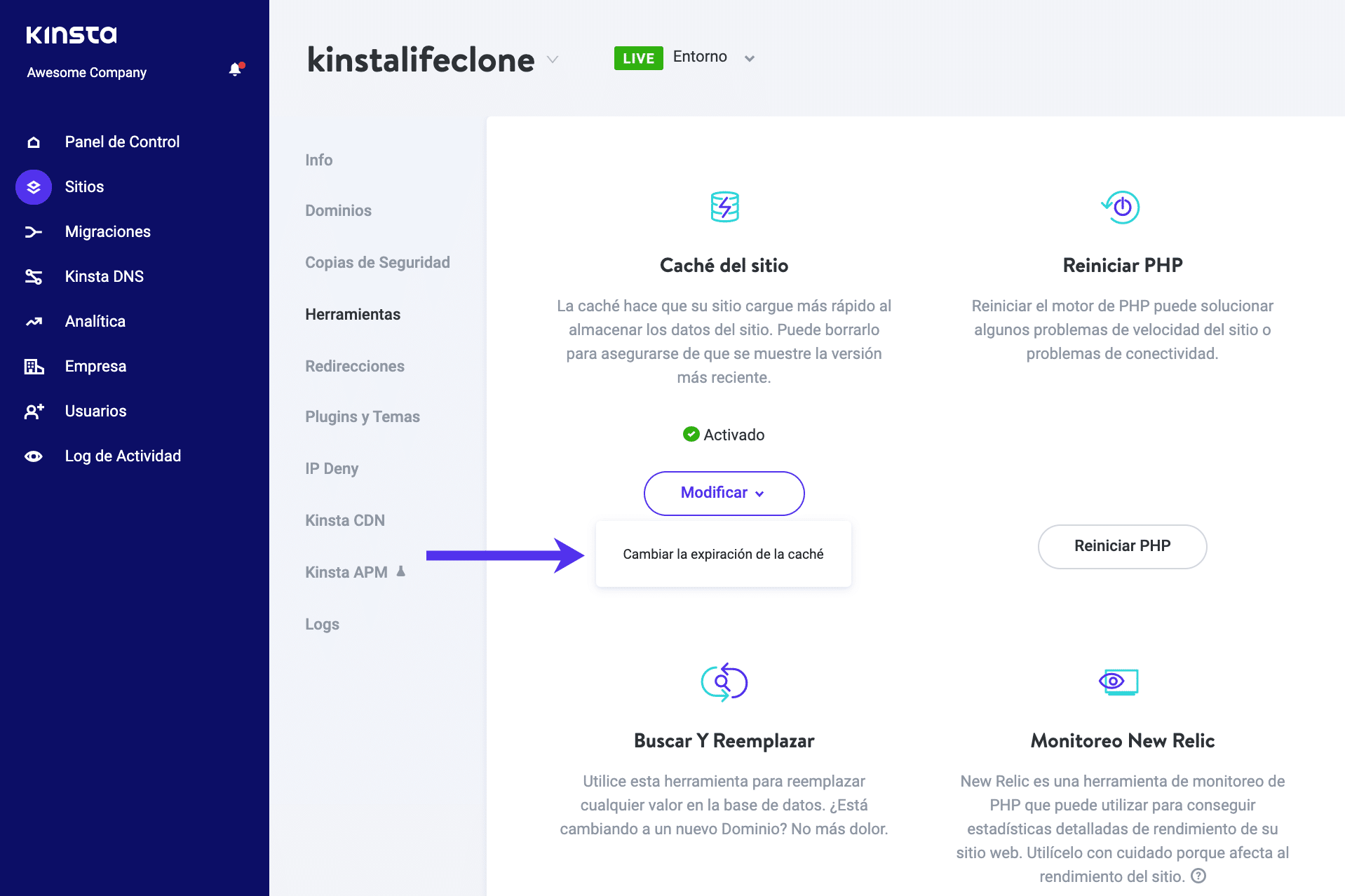 Como hemos mencionado varias veces en este artículo, Kinsta ya ofrece un sistema de limpieza de la caché para automatizarla, limpiarla manualmente y purgarla en un horario establecido.