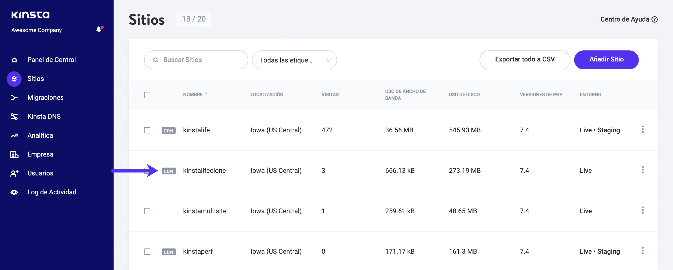 Localiza el sitio para el que deseas borrar los archivos de caché de WordPress.