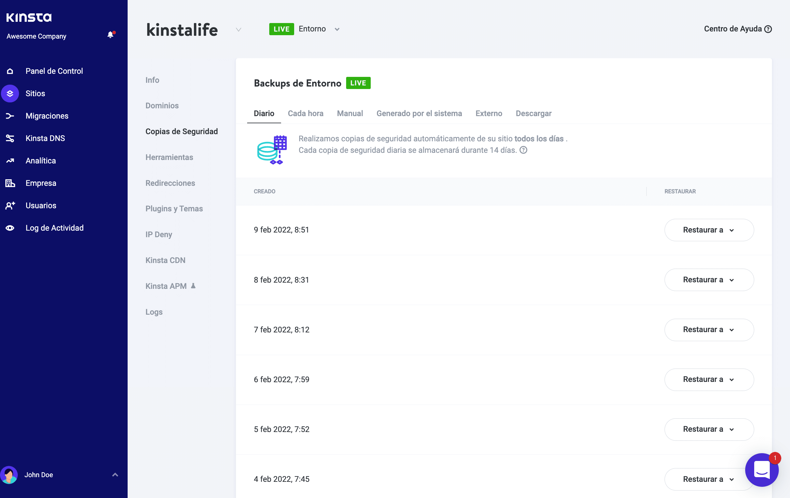 Si existe la posibilidad de que quieras recuperar estas cosas, te recomendamos que hagas una copia de seguridad de tu sitio web. Si utilizas Kinsta, puedes hacer una copia de seguridad de tu sitio web siguiendo estos pasos: